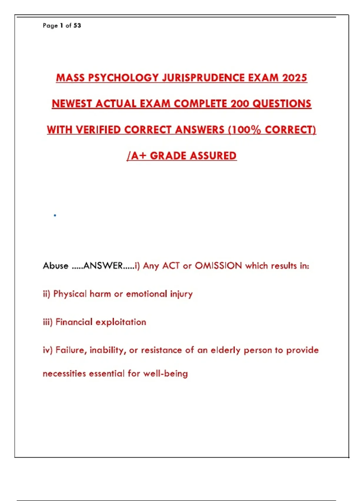 Ace the 2025 Mass Psychology Jurisprudence Exam with this complete study guide. Contains all 200 questions and verified correct answers from the newest actual exam. This is the most up-to-date resource to ensure you are fully prepared, understand the key legal and ethical principles, and pass with confidence on your first attempt.