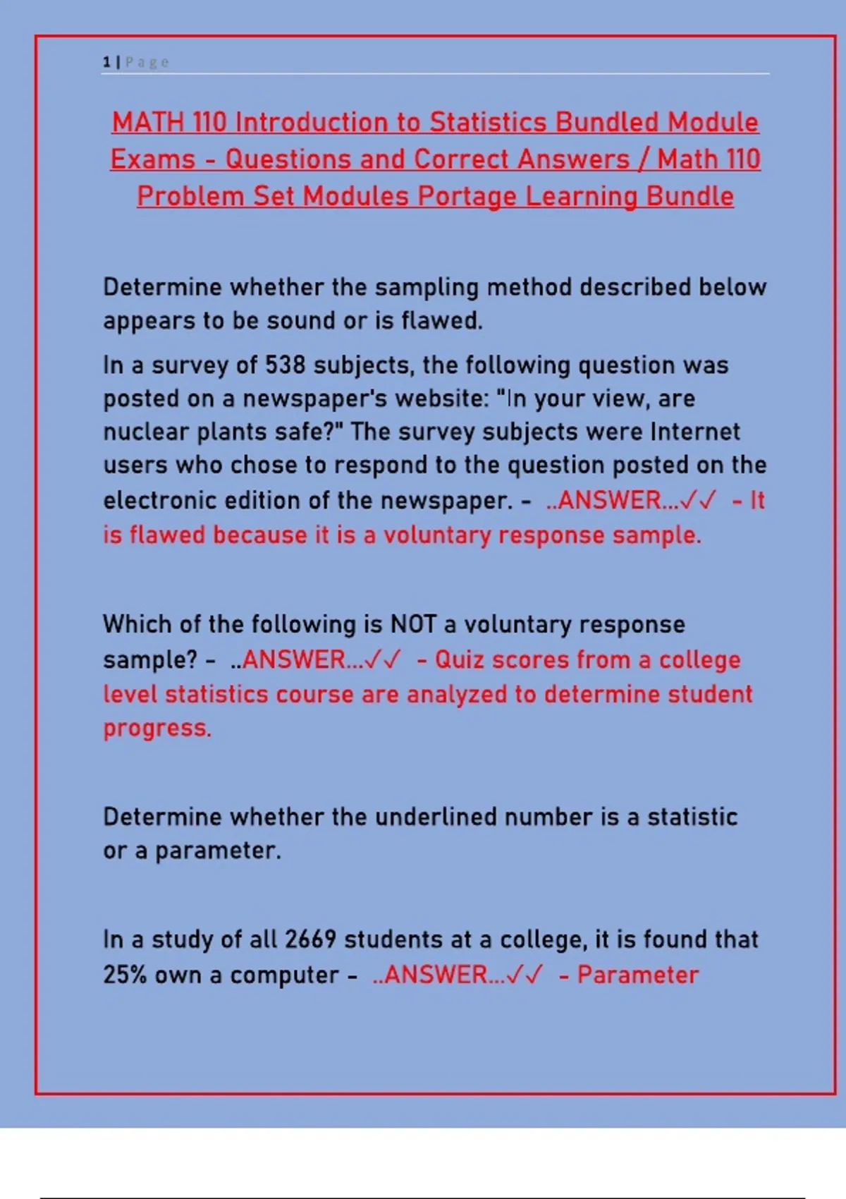 MATH 110 Introduction to Statistics Bundled Exams | Module Tests & Solutions