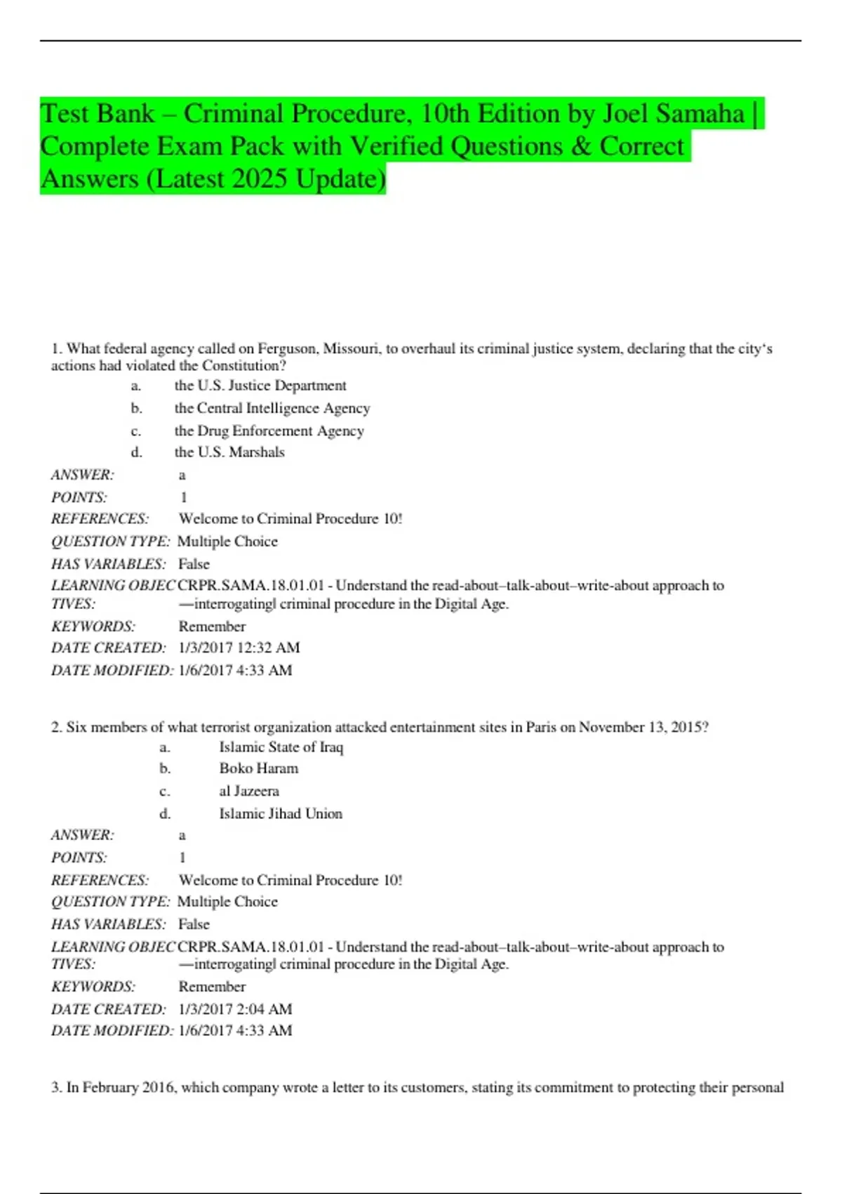 Test Bank – Criminal Procedure, 10th Edition (Joel Samaha) | Complete Exam Pack with Verified Questions & Correct Answers | Latest 2025 Update
