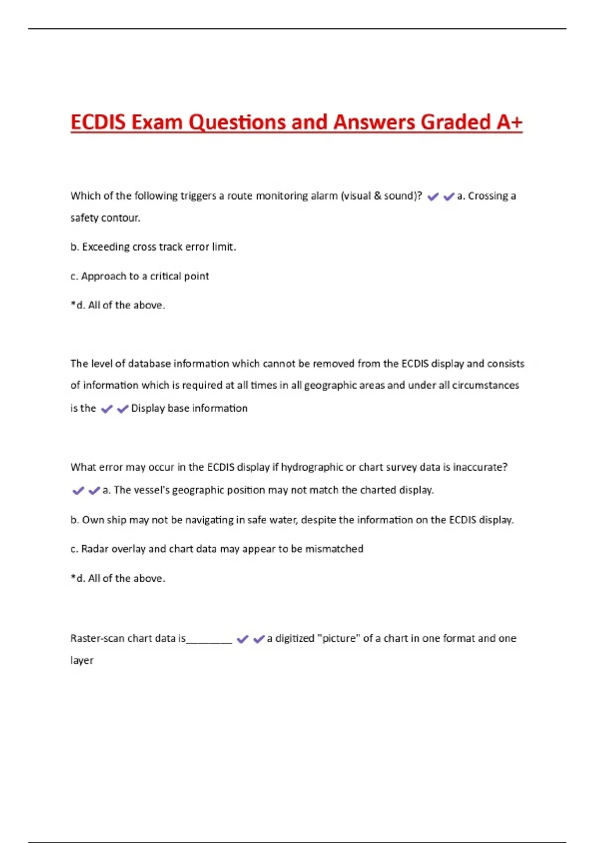 ECDIS Exam Questions and Answers Graded A+ Which of the following triggers a route monitoring alarm (visual & sound)? safety contour. b. Exceeding cross track error limit. c. Approach to a critical point *d. All of the above. a. Crossing a The level of database information which cannot be removed from the ECDIS display and consists of information which is required at all times in all geographic areas and under all circumstances is the Display base information