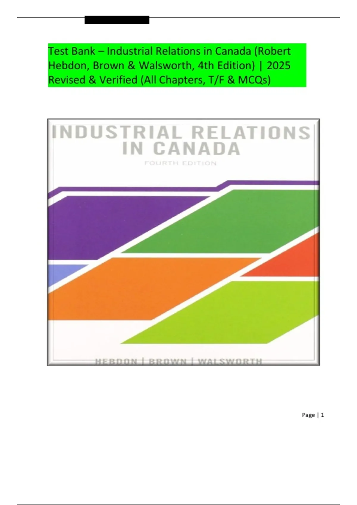 The Test Bank for Industrial Relations in Canada 4th Edition by Robert Hebdon, Travor Brown, and Scott Walsworth provides a comprehensive 2025 updated collection of multiple-choice, true/false, and discussion-based questions covering every chapter of the textbook. This verified and revised edition is designed to help students understand key concepts such as collective bargaining, labour relations, dispute resolution, union-management relations, and Canadian employment law. Perfect for HR, business, and industrial relations courses, this study resource offers instructor-approved answers to help you prepare confidently for midterms, finals, and professional certification exams.