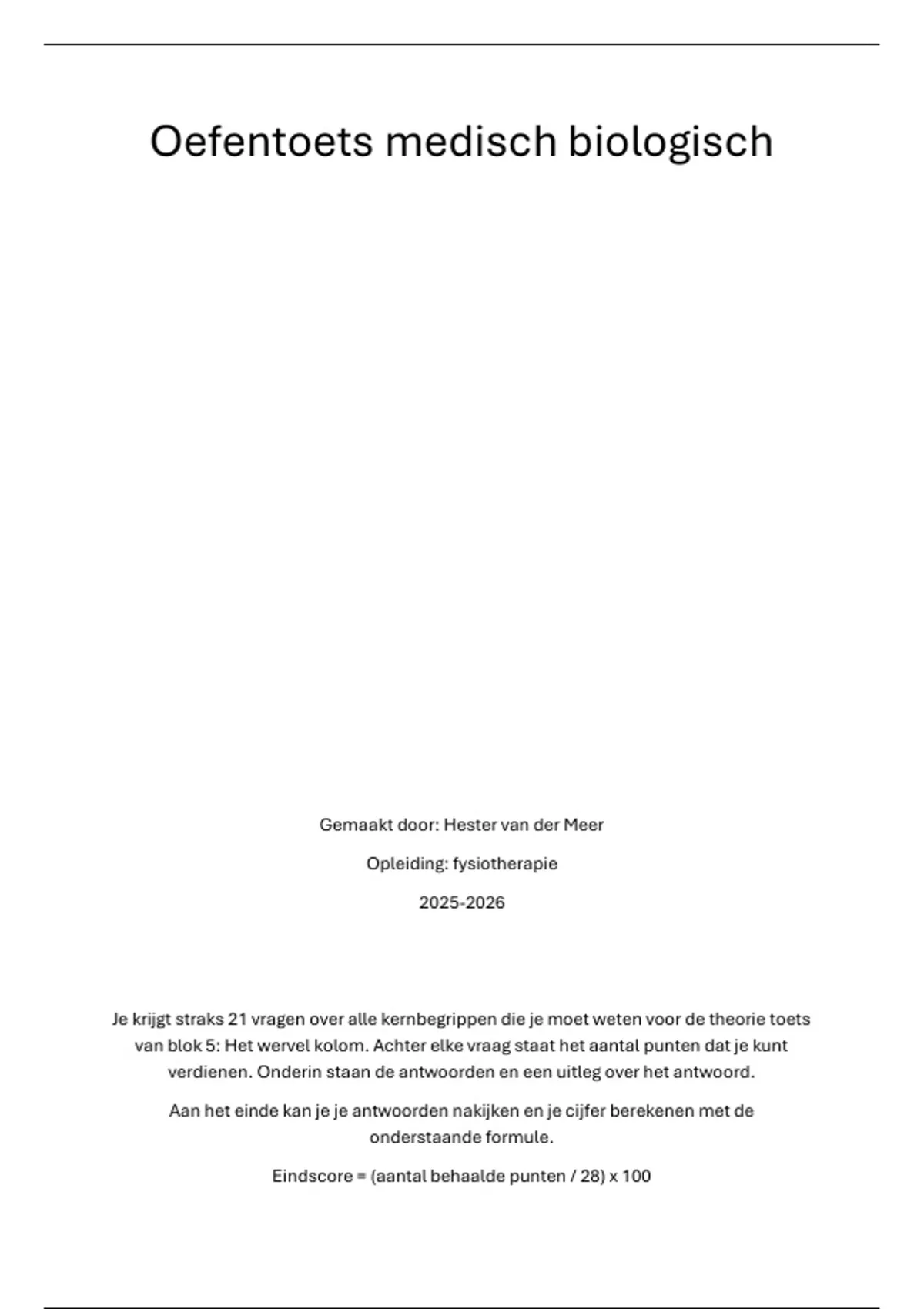 Deze oefentoets voor fysiotherapie blok 5 (wervelkolom) bevat 21 vragen over alle medisch biologische kernbegrippen. De toets bestaat uit open en gesloten vragen, inclusief casusvragen. De toets heeft ook een puntentelling en een formule om je cijfer mee te berekenen. Ideaal voor studenten die zich willen voorbereiden op het tentamen!