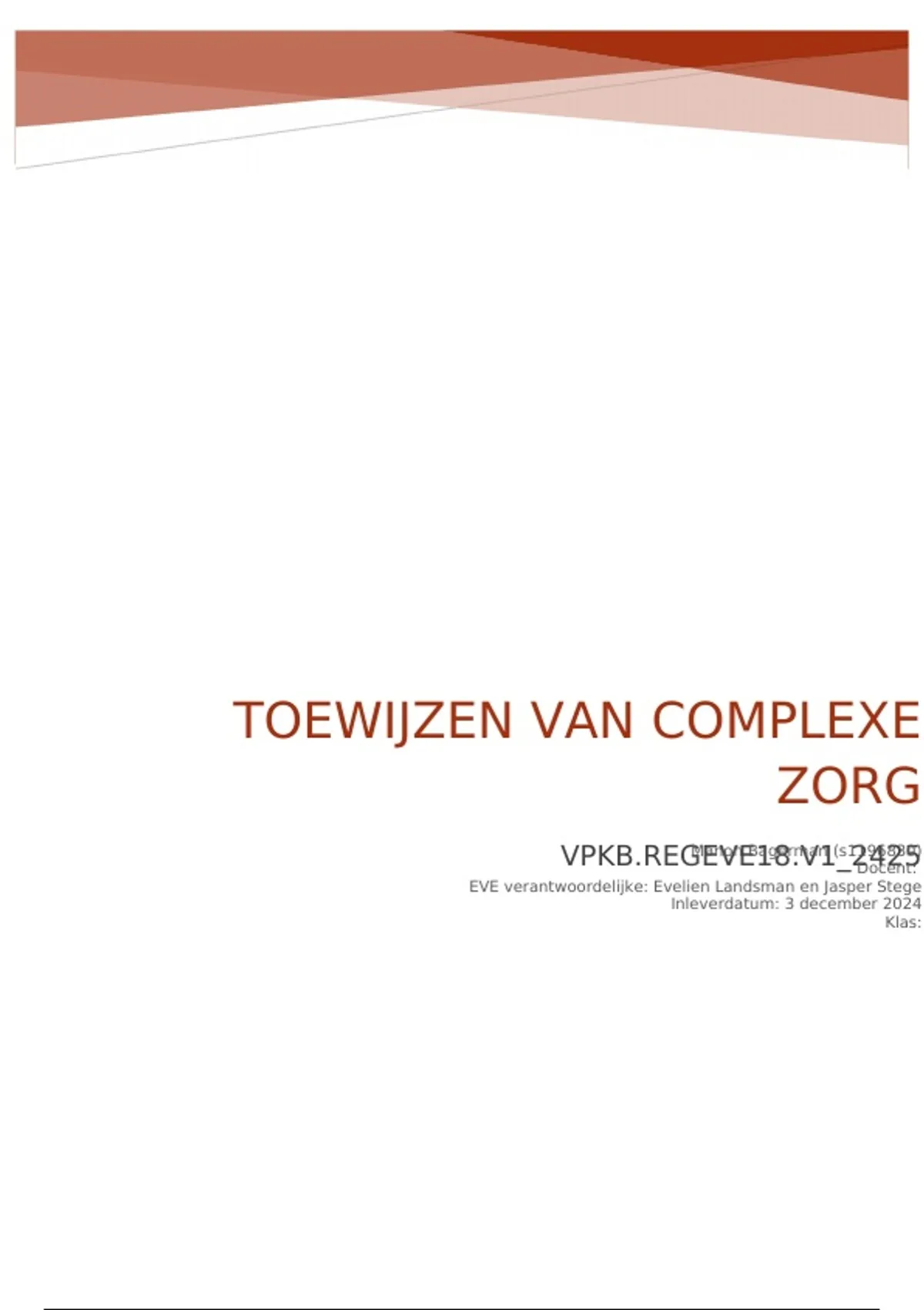 Voor u ligt het verslag over het toewijzen van complexe zorg. Dit verslag is geschreven om mij als