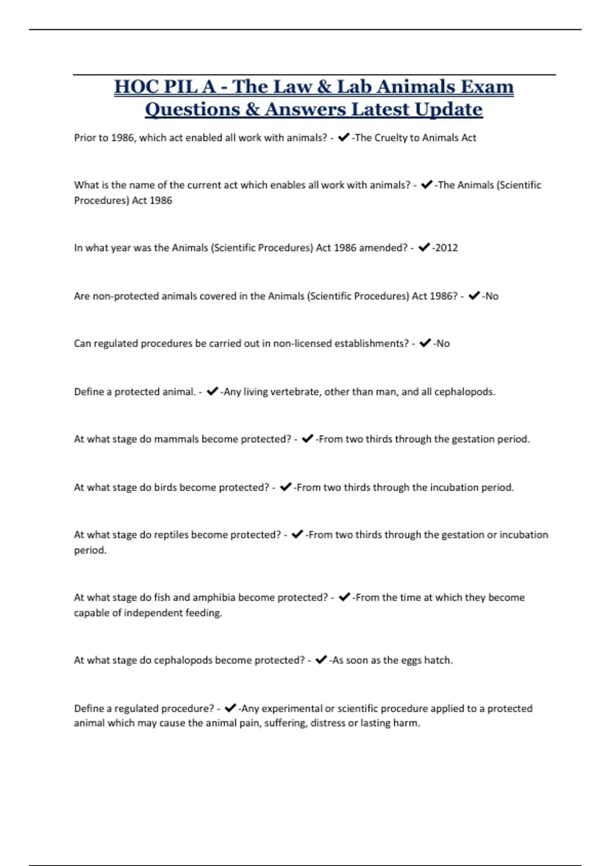 , HOC PIL A - The Law & Lab Animals Exam Questions & Answers Latest Update