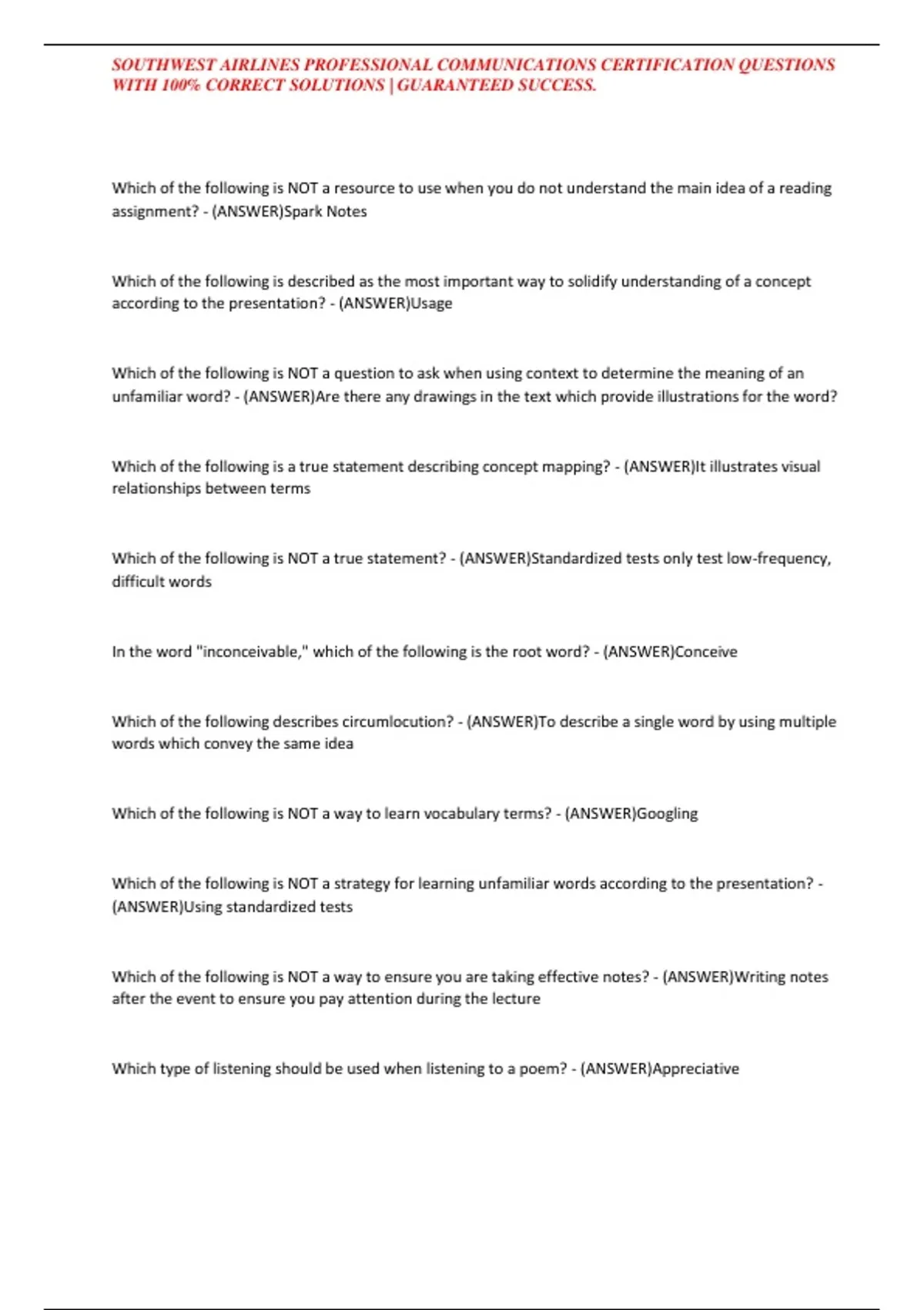 , SOUTHWEST AIRLINES PROFESSIONAL COMMUNICATIONS CERTIFICATION QUESTIONS