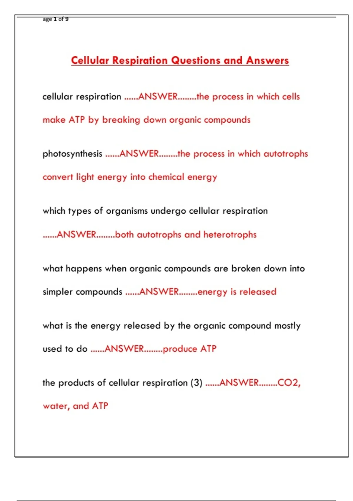 Cellular Respiration Questions and Answers