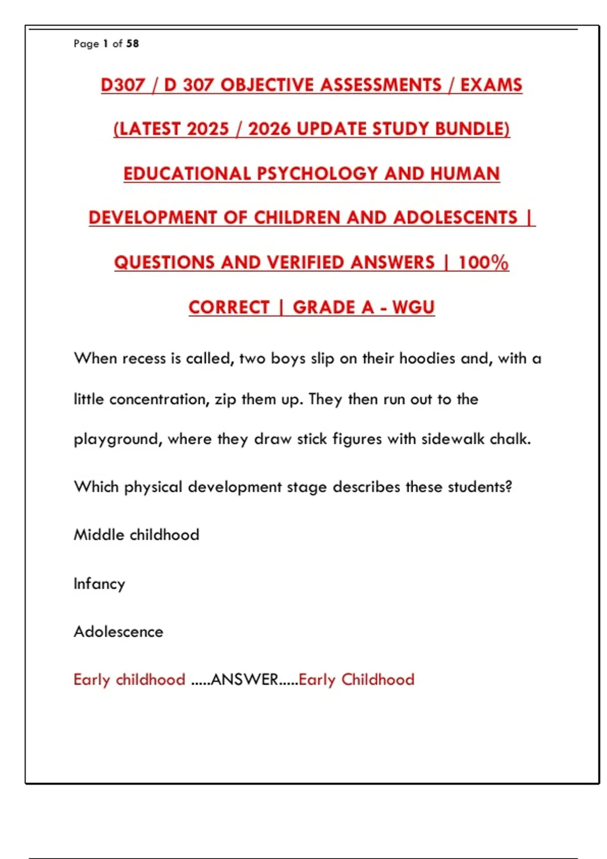 Pass your WGU D307 Educational Psychology and Human Development of Children and Adolescents OA. Our 2025 study bundle includes verified questions and answers on Piaget, Vygotsky, Erikson, and learning theories for the WGU teachers college.
