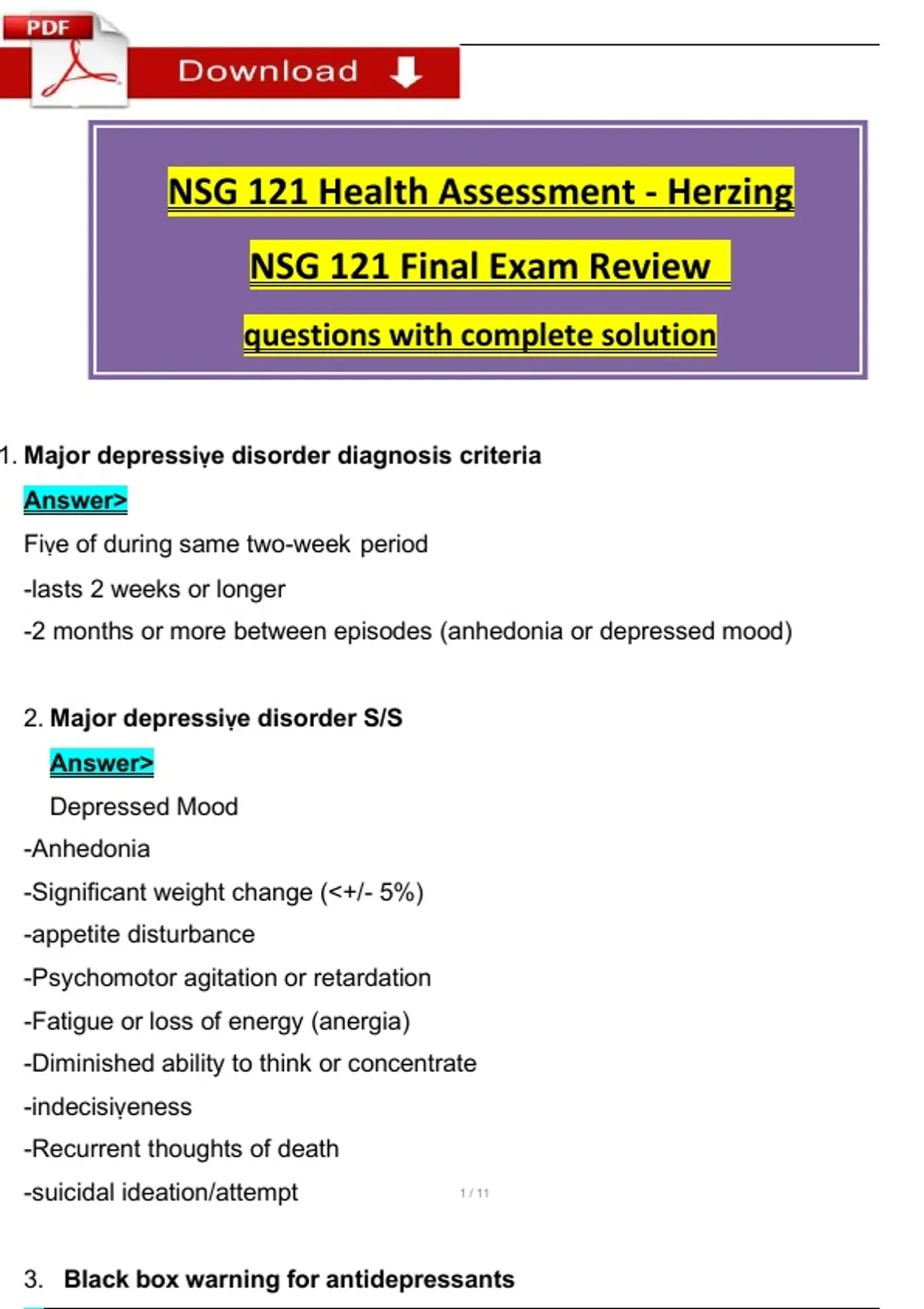 This document provides a full review of the NSG 121 Health Assessment material covered at Herzing University, focusing specifically on preparation for the final exam. It includes exam-style questions with complete, detailed solutions to help students understand key assessment concepts and clinical reasoning steps. The content aligns with the major topics addressed throughout the course and supports effective revision for theory and practical components.