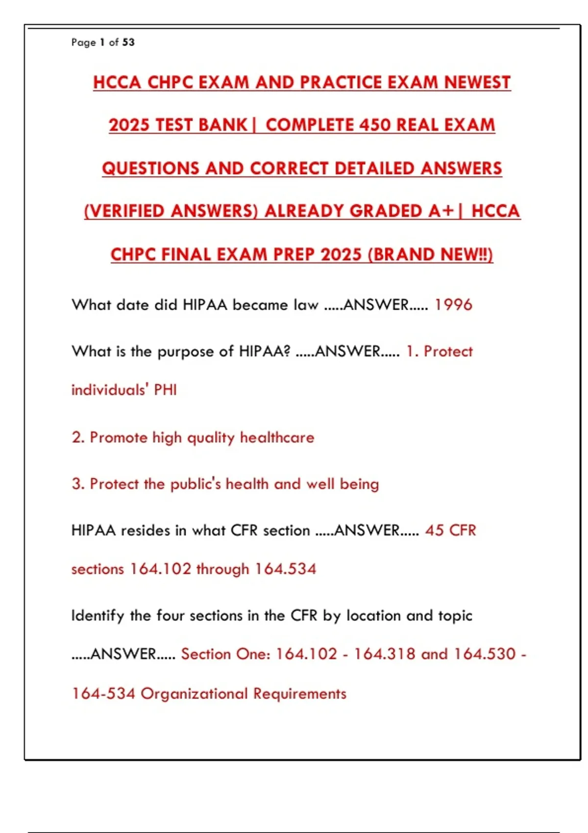 (VERIFIED ANSWERS) ALREADY GRADED A+| HCCA