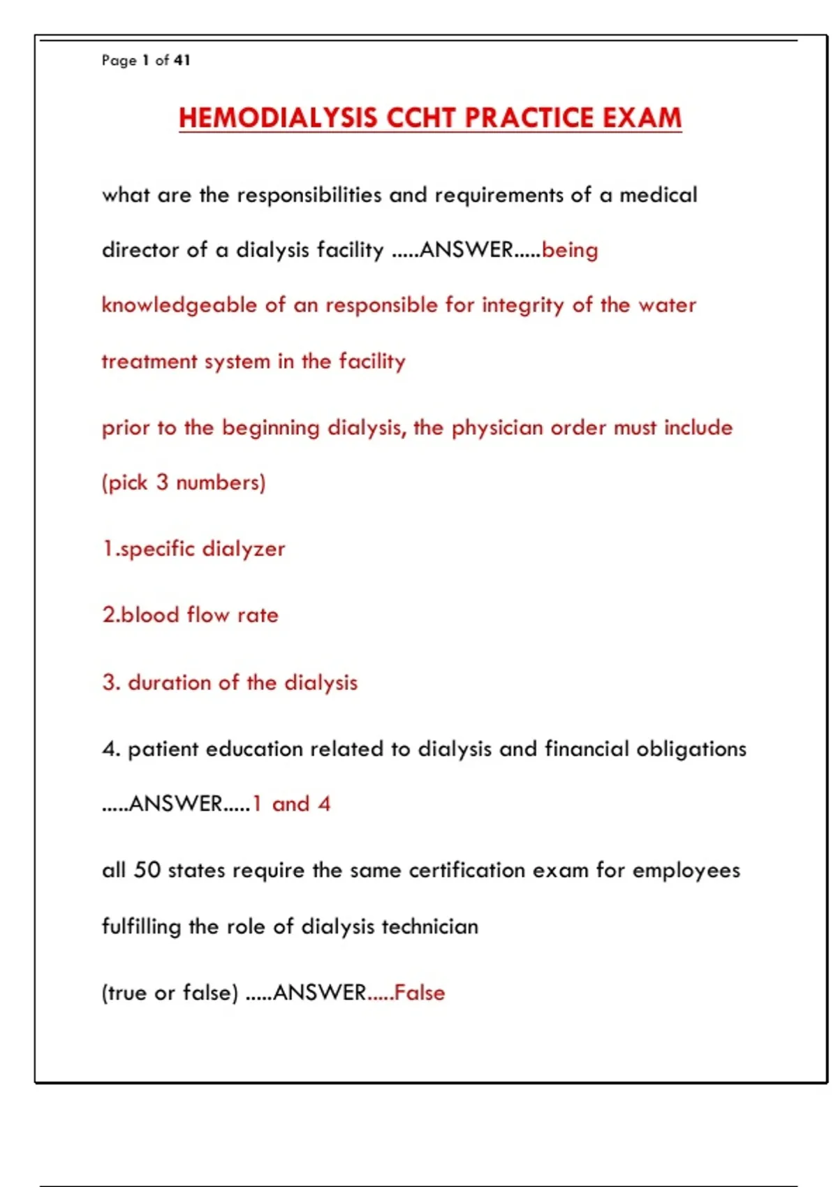HEMODIALYSIS CCHT PRACTICE EXAM