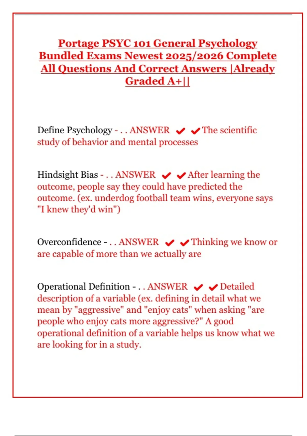 Ace your Portage Learning PSYC 101 General Psychology course with the newest 2025 bundled exams. This comprehensive package includes practice tests covering key concepts in research methods, cognition, development, and social psychology to help you pass your exams.