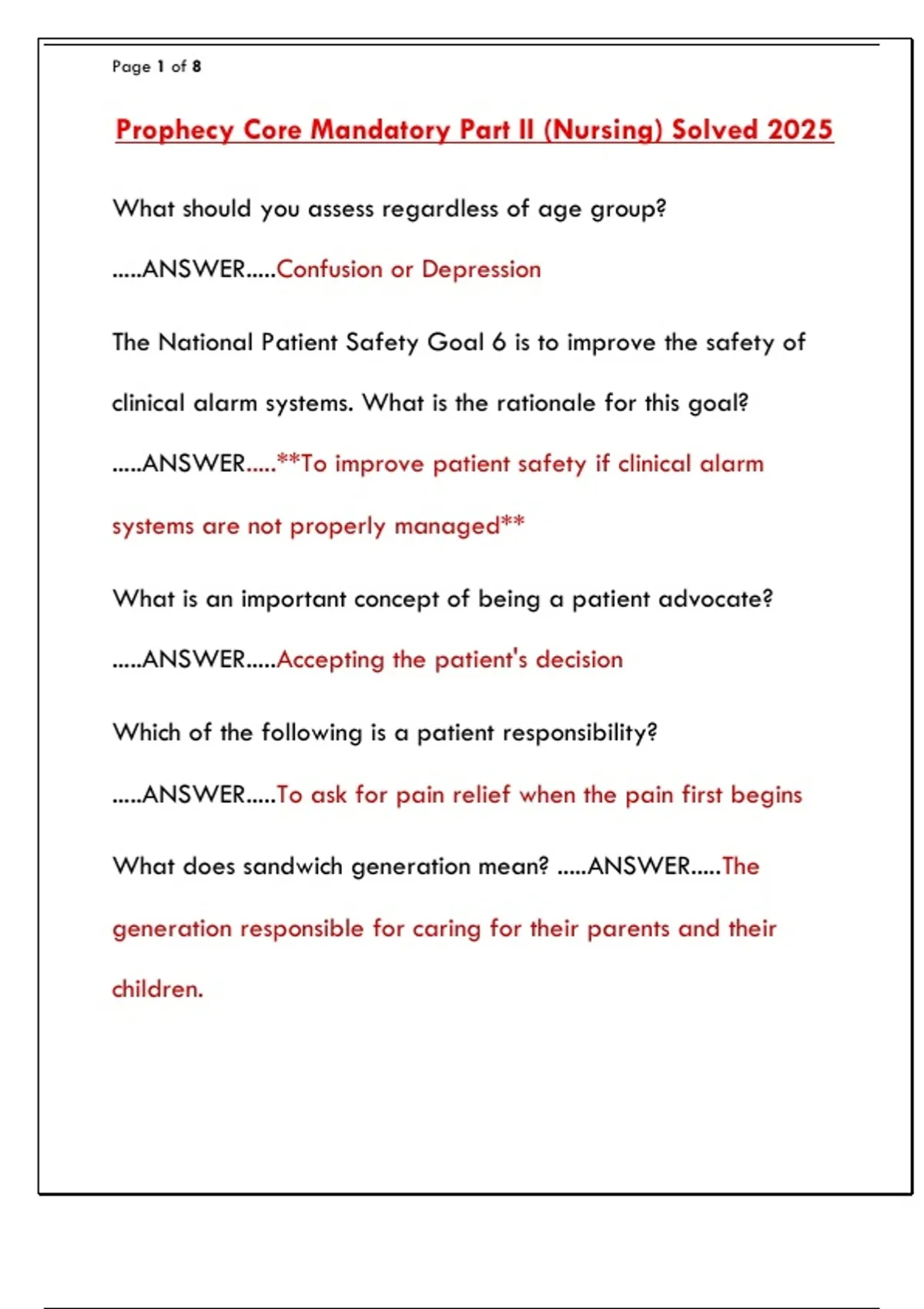 Prophecy Core Mandatory Part II (Nursing) Solved 2025
