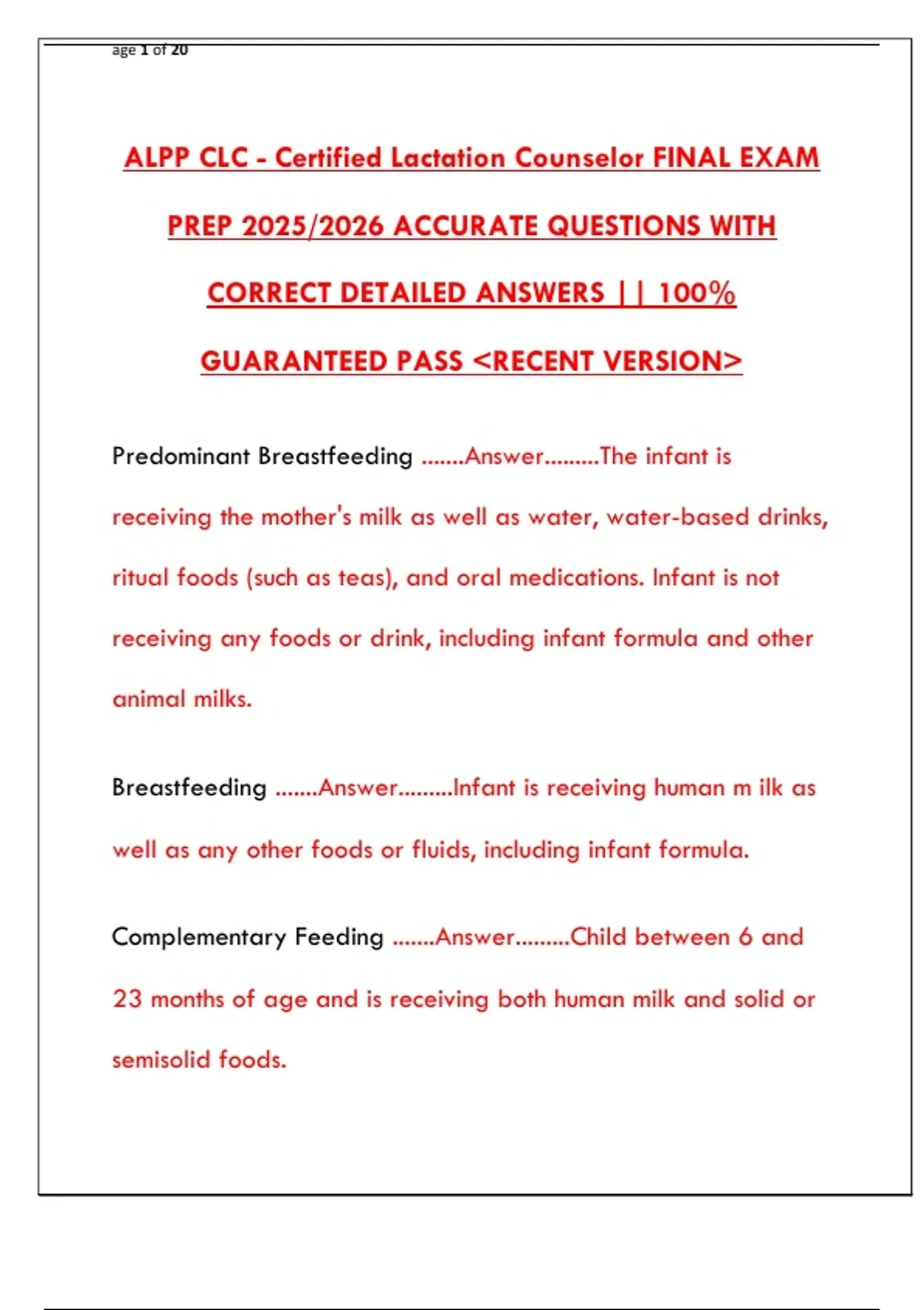 ALPP CLC - Certified Lactation Counselor FINAL EXAM