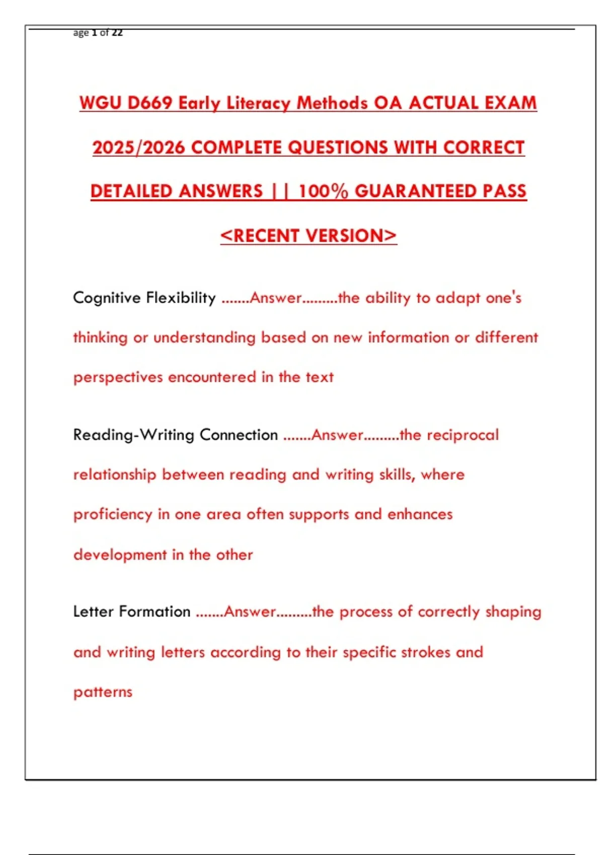 WGU D669 Early Literacy Methods OA ACTUAL EXAM