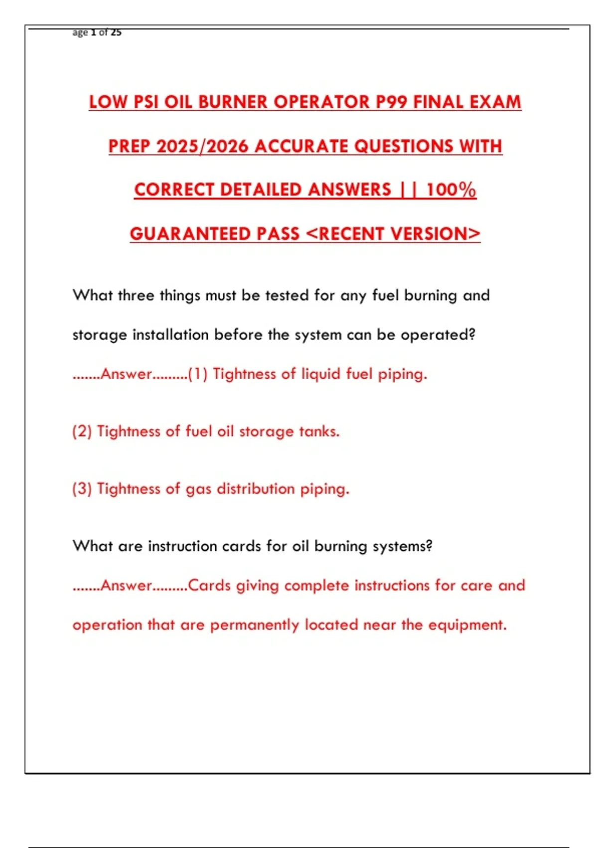 LOW PSI OIL BURNER OPERATOR P99 FINAL EXAM