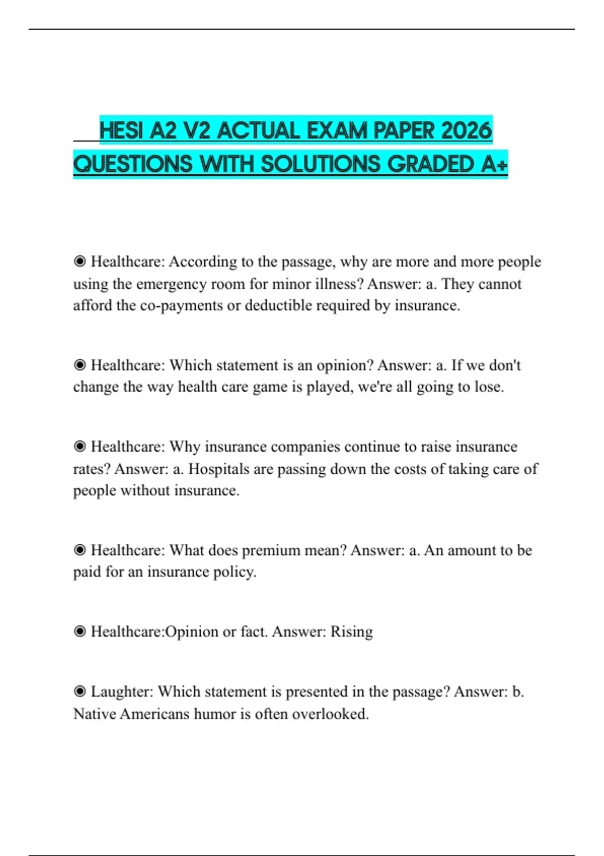 HESI A2 V2 ACTUAL EXAM PAPER 2026 QUESTIONS WITH SOLUTIONS GRADED A+