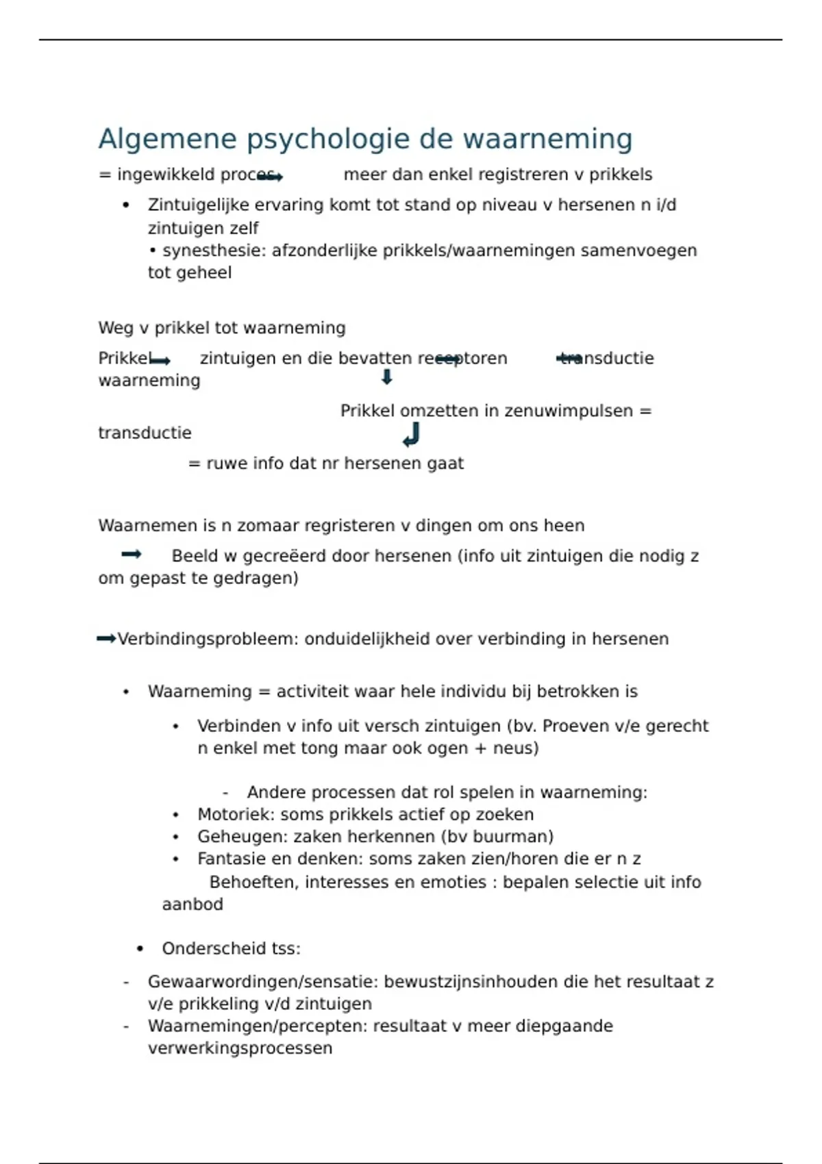 Dit is een samenvatting van het vak algemene psychologie van het derde hoofdstuk. Het document bevat de leerstof vanuit de hoorcolleges en is aangevuld met het boek. Het document over waarneming legt uit hoe we informatie uit de omgeving verwerken. Het beschrijft hoe we prikkels selecteren via aandacht, hoe de hersenen deze ordenen met behulp van Gestaltprincipes en waarnemingsconstanties, en hoe we ze interpreteren op basis van kennis, ervaringen en verwachtingen. Ook wordt uitgelegd waarom waarneming niet objectief is en hoe dit kan leiden tot illusies, fouten en vertekeningen in wat we denken te zien.