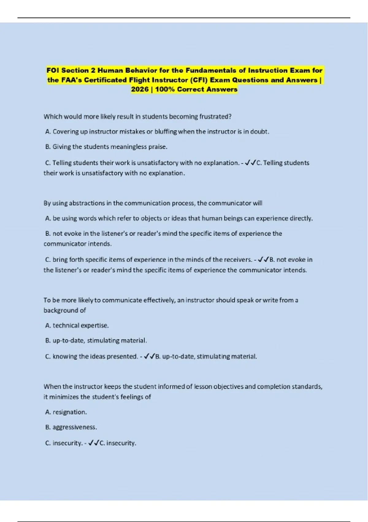 FOI Section 2 Human Behavior for the Fundamentals of Instruction Exam for the FAA's Certificated Flight Instructor (CFI) Exam Questions and Answers | 2026 | 100% Correct Answers