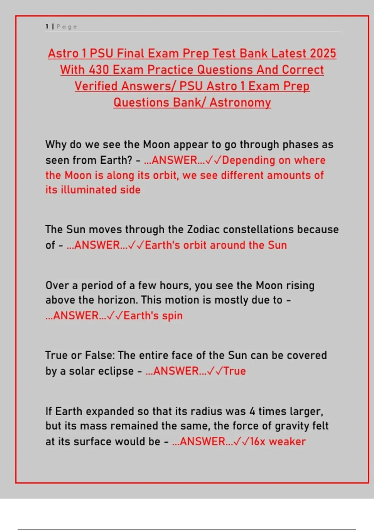 Ace your Penn State Astronomy 1 (Astro 1) final exam with the latest 2025 test bank. Access 430 practice questions with correct answers for comprehensive topic review and confident preparation.