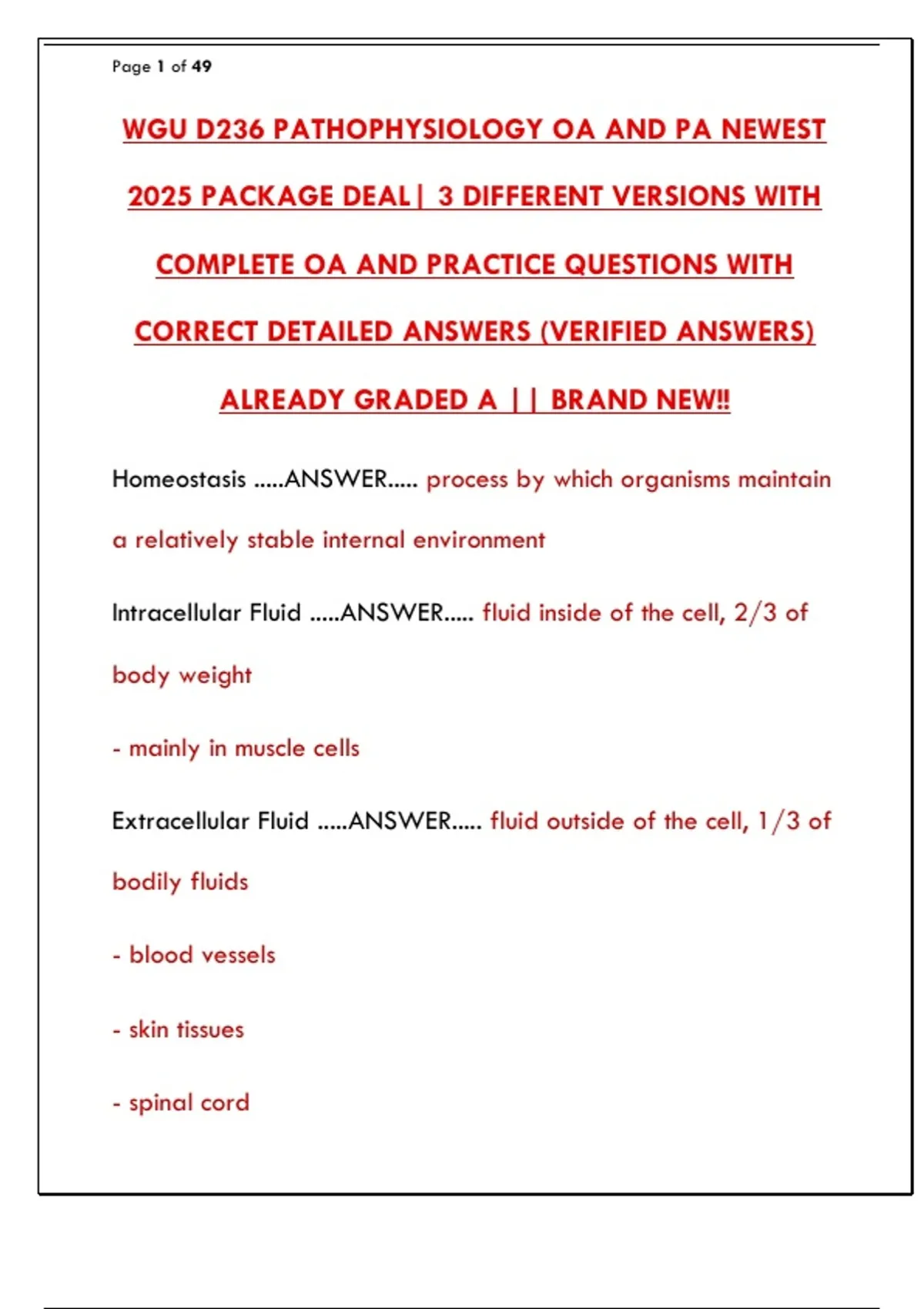 Pass WGU D236 Pathophysiology on your first attempt with the 2025 all-in-one package deal. This bundle includes practice tests for both the Pre-Assessment (PA) and Objective Assessment (OA), detailed rationales, and a comprehensive study guide covering disease processes, systemic disorders, and cellular biology for nursing students.