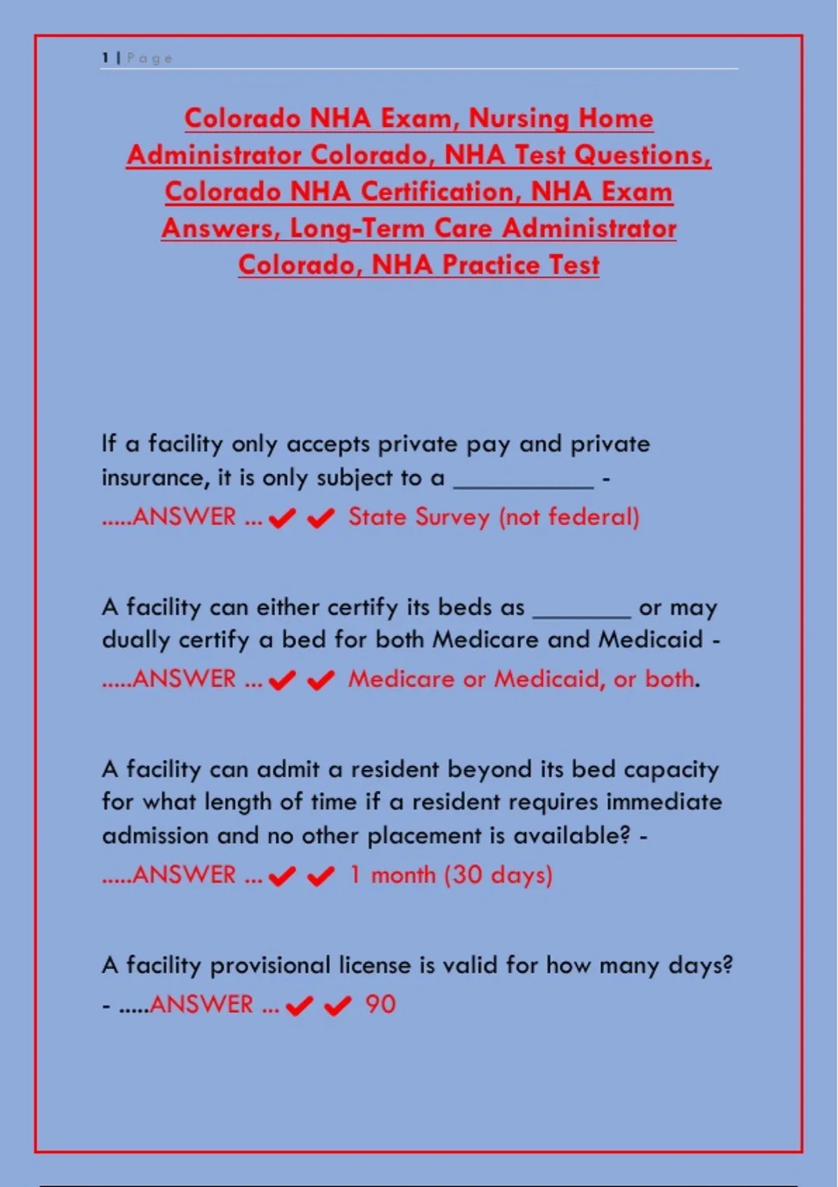 Get ready for the Colorado Nursing Home Administrator (NHA) exam with this comprehensive PDF guide. Includes exam content outlines, state-specific regulations, practice questions, study tips, and resources to help you pass the Colorado NHA licensing test.