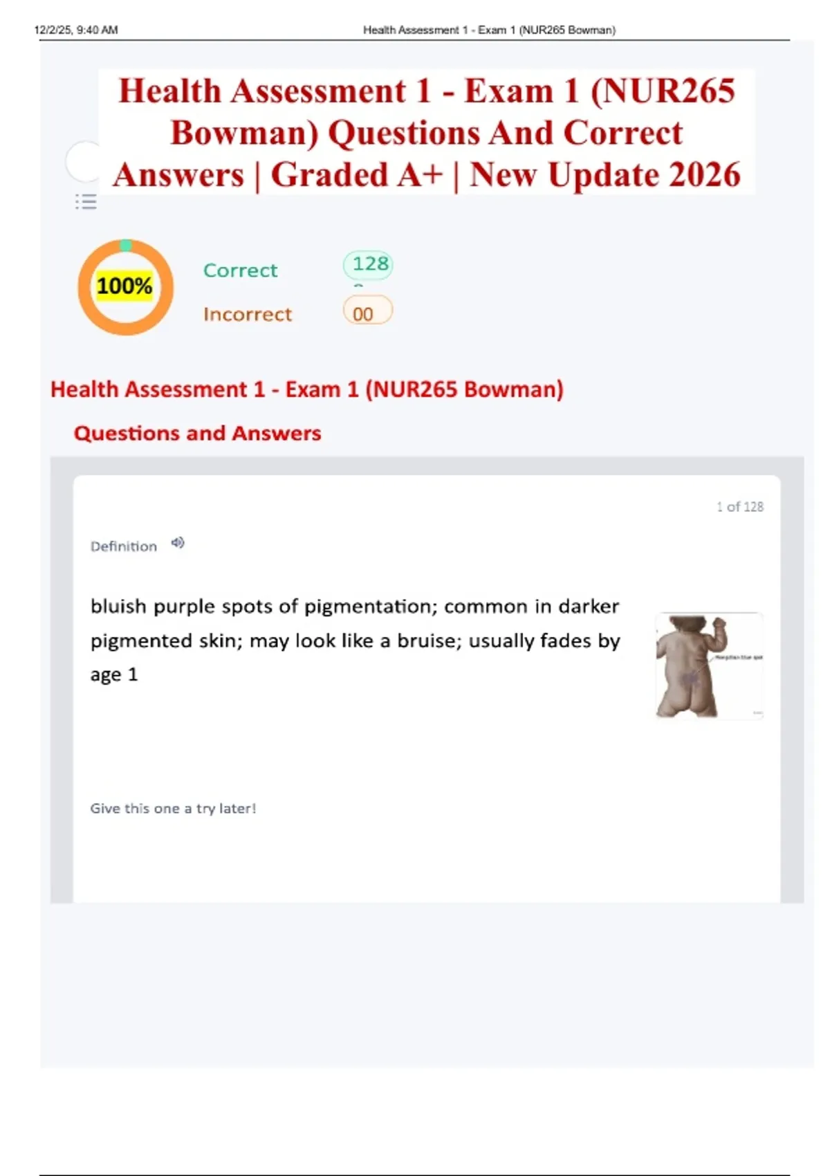 , 12/2/25, 9:40 AM Health Assessment 1 - Exam 1 (NUR265 Bowman)