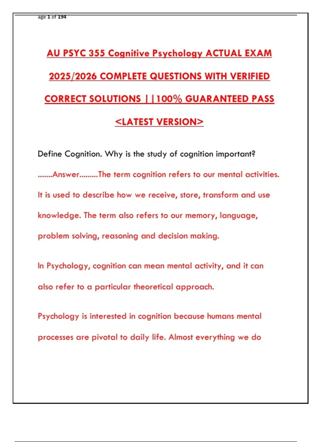 AU PSYC 355 Cognitive Psychology ACTUAL EXAM
