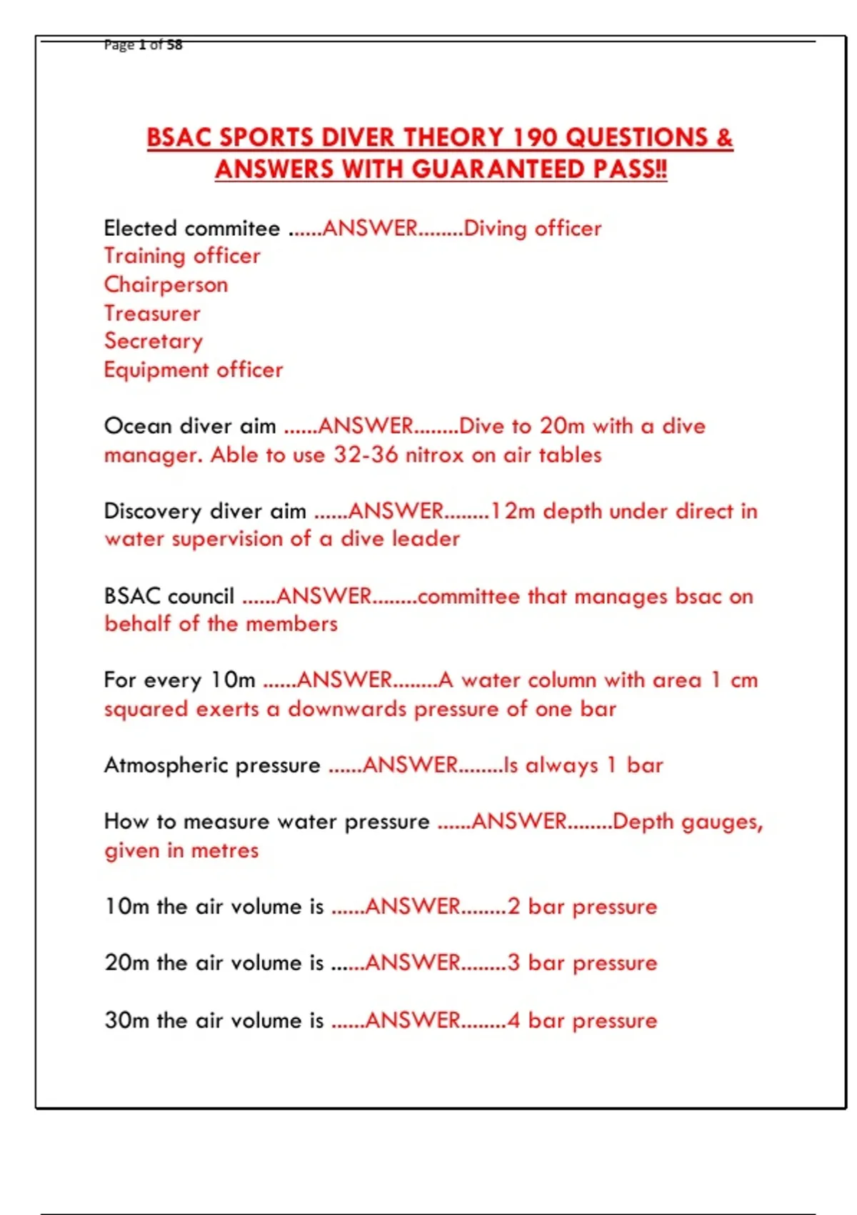 BSAC SPORTS DIVER THEORY 190 QUESTIONS &
