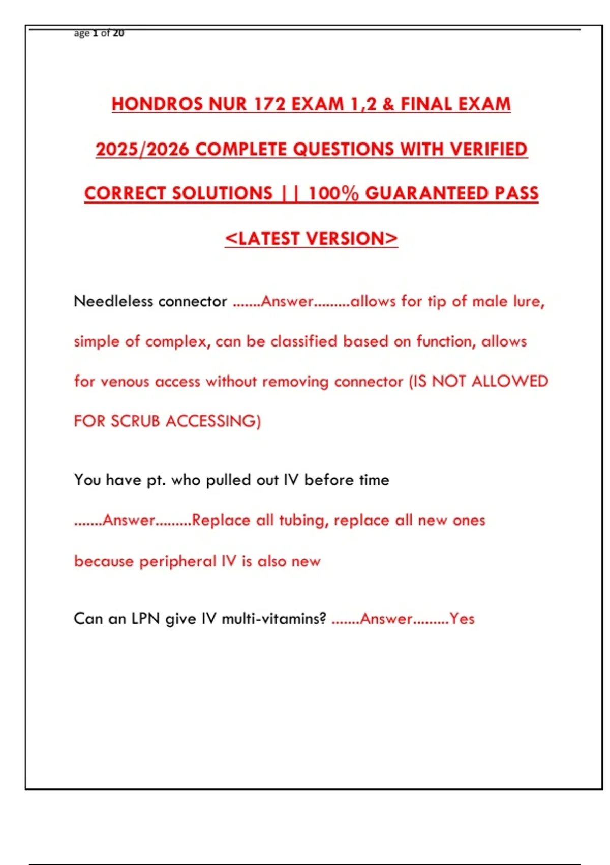 HONDROS NUR 172 EXAM 1,2 & FINAL EXAM