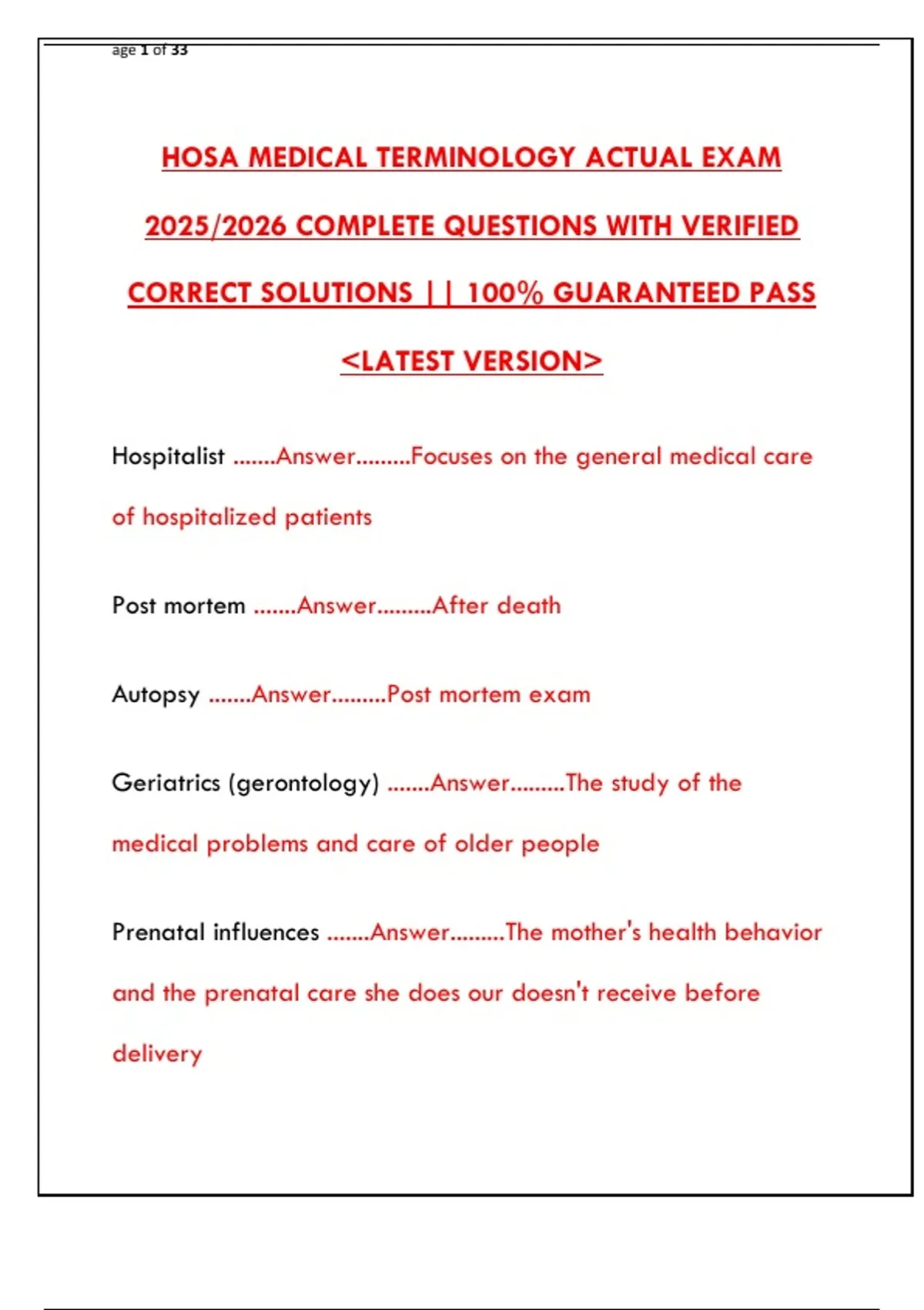 HOSA MEDICAL TERMINOLOGY ACTUAL EXAM