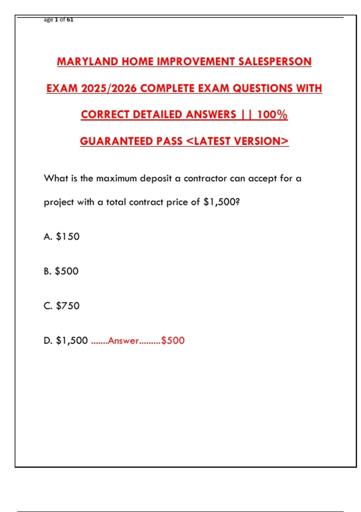 D. $1,500 .......Answer.........$500