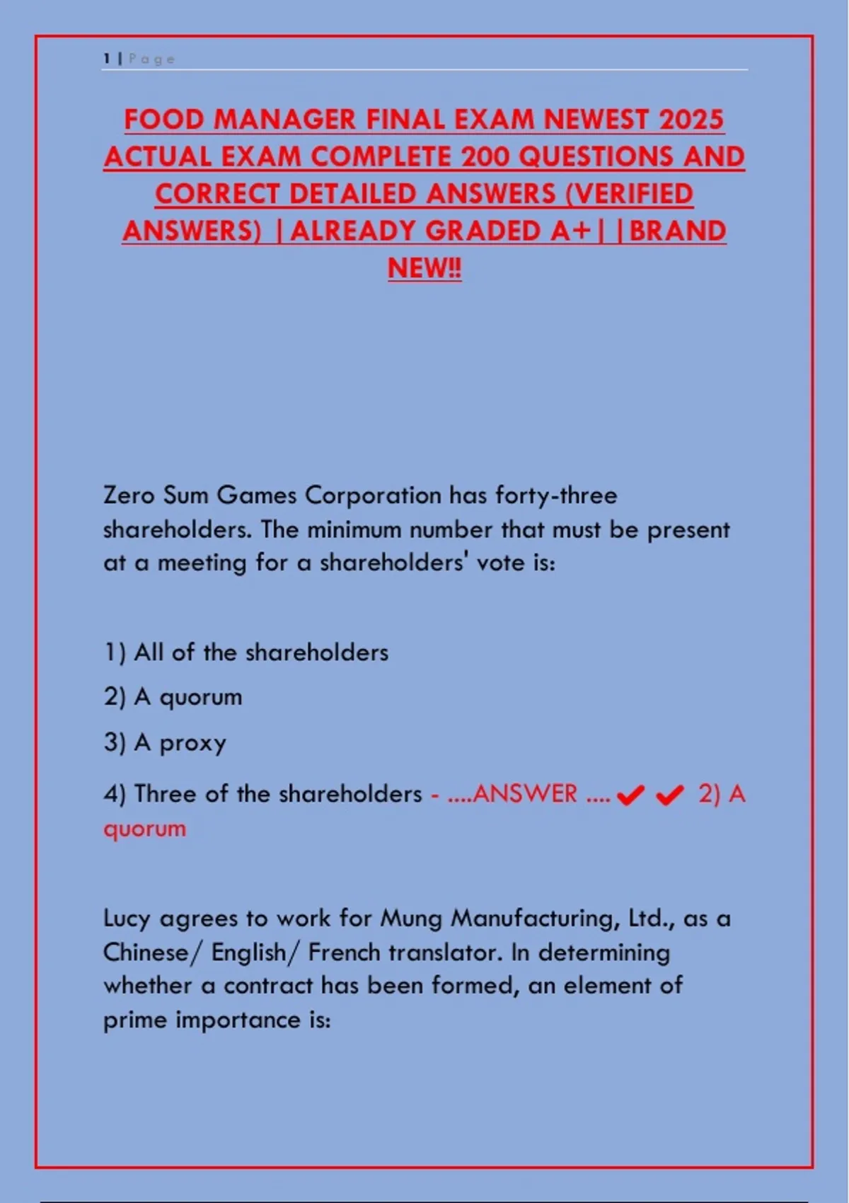 FOOD MANAGER FINAL EXAM NEWEST 2025