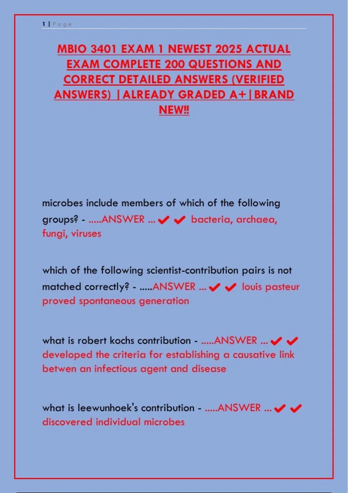 Prepare for your MBIO 3401 (Microbiology) Exam 1 with the newest 2025 study resource. This complete guide contains 200 actual exam questions with correct, detailed answers, covering microbial structure, metabolism, genetics, and lab techniques for guaranteed academic success.