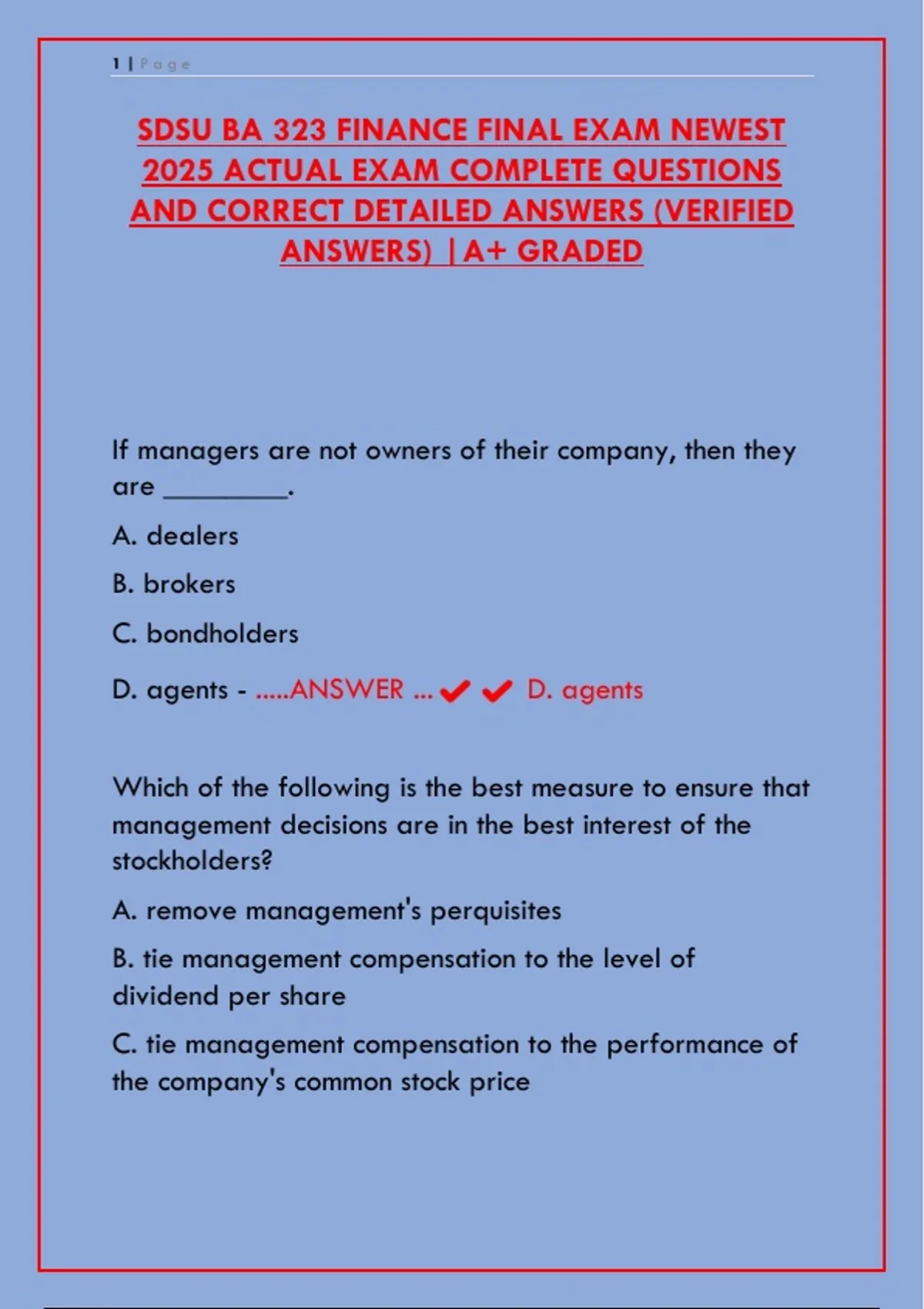 SDSU BA 323 Finance Final Exam 2025: Complete Questions & Detailed Answers | Study Guide