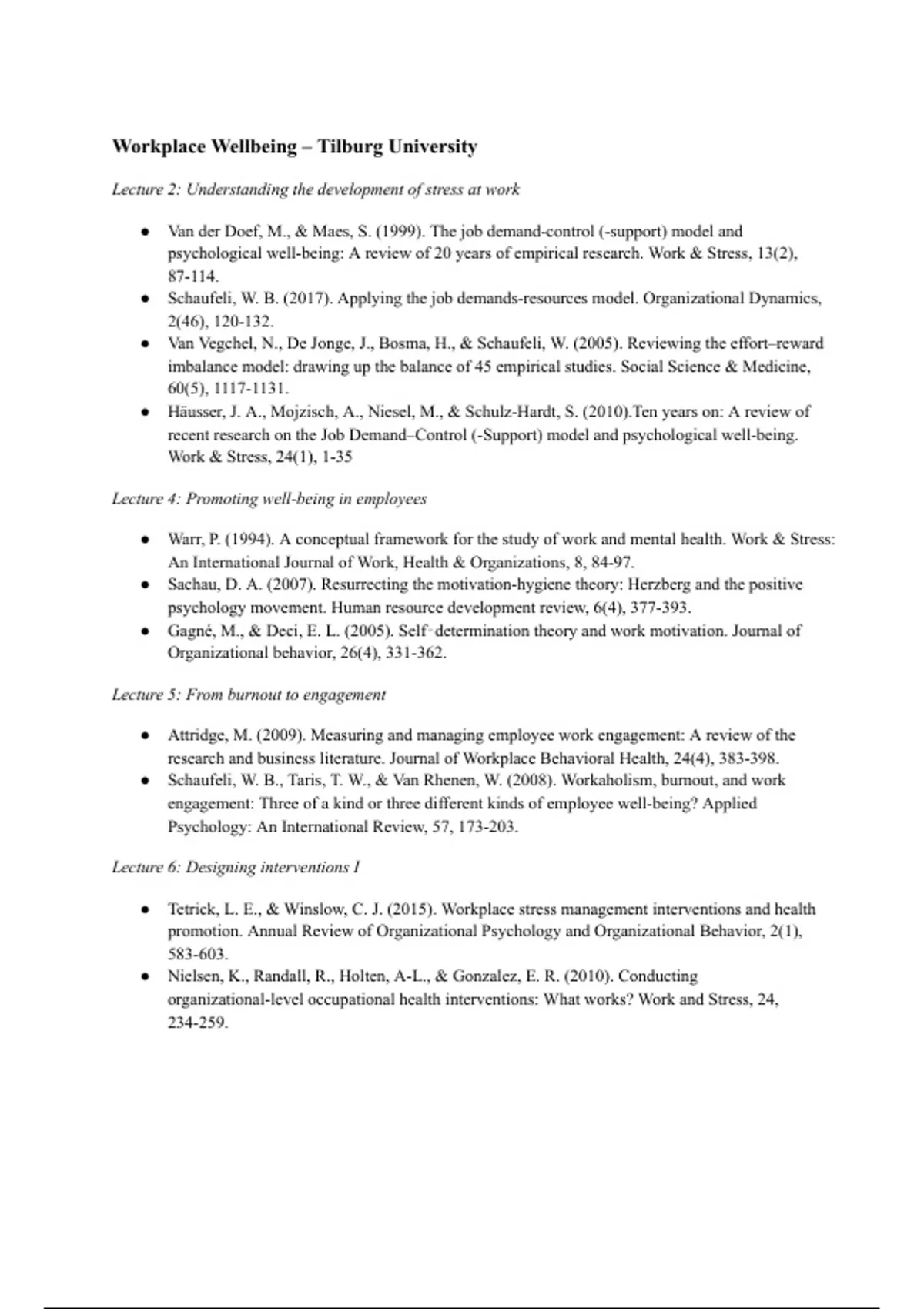 ● Tetrick, L. E., & Winslow, C. J. (2015). Workplace stress management interventions and health