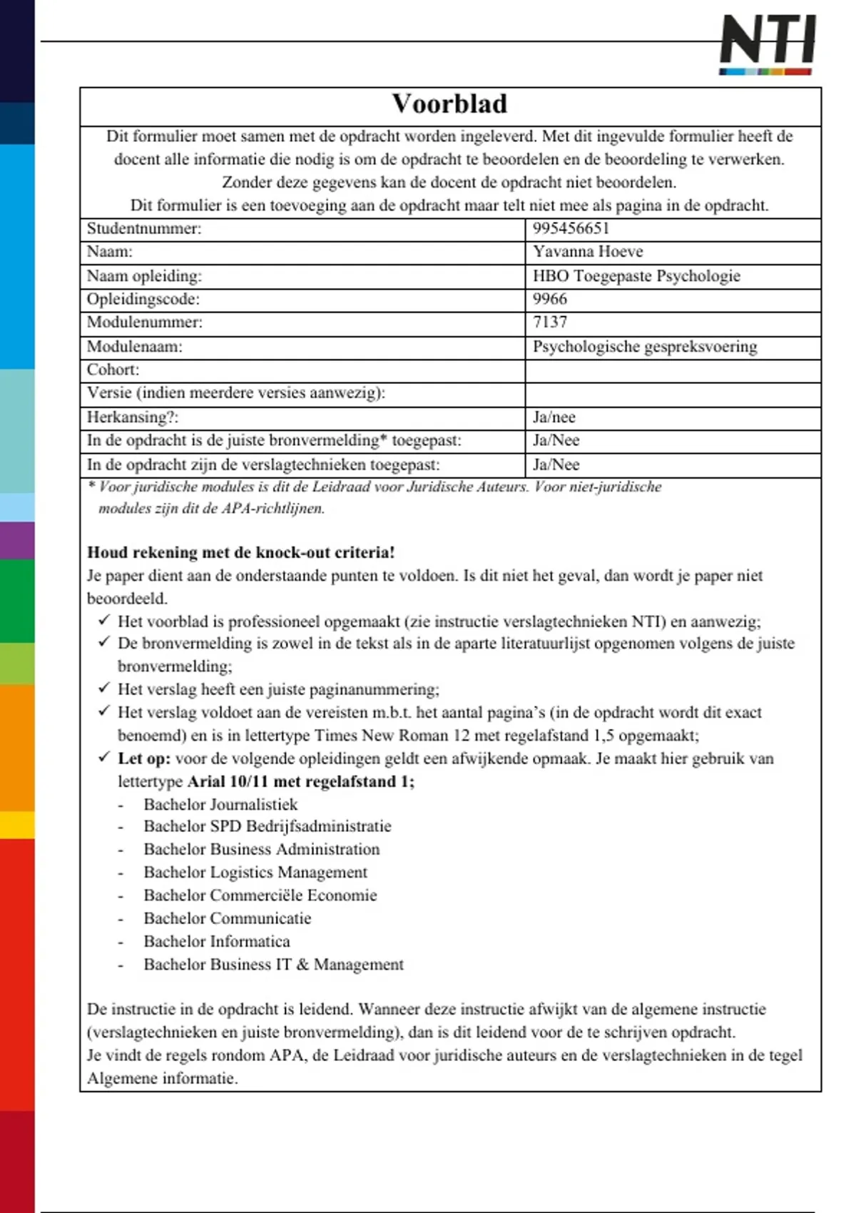 ü Het voorblad is professioneel opgemaakt (zie instructie verslagtechnieken NTI) en aanwezig;