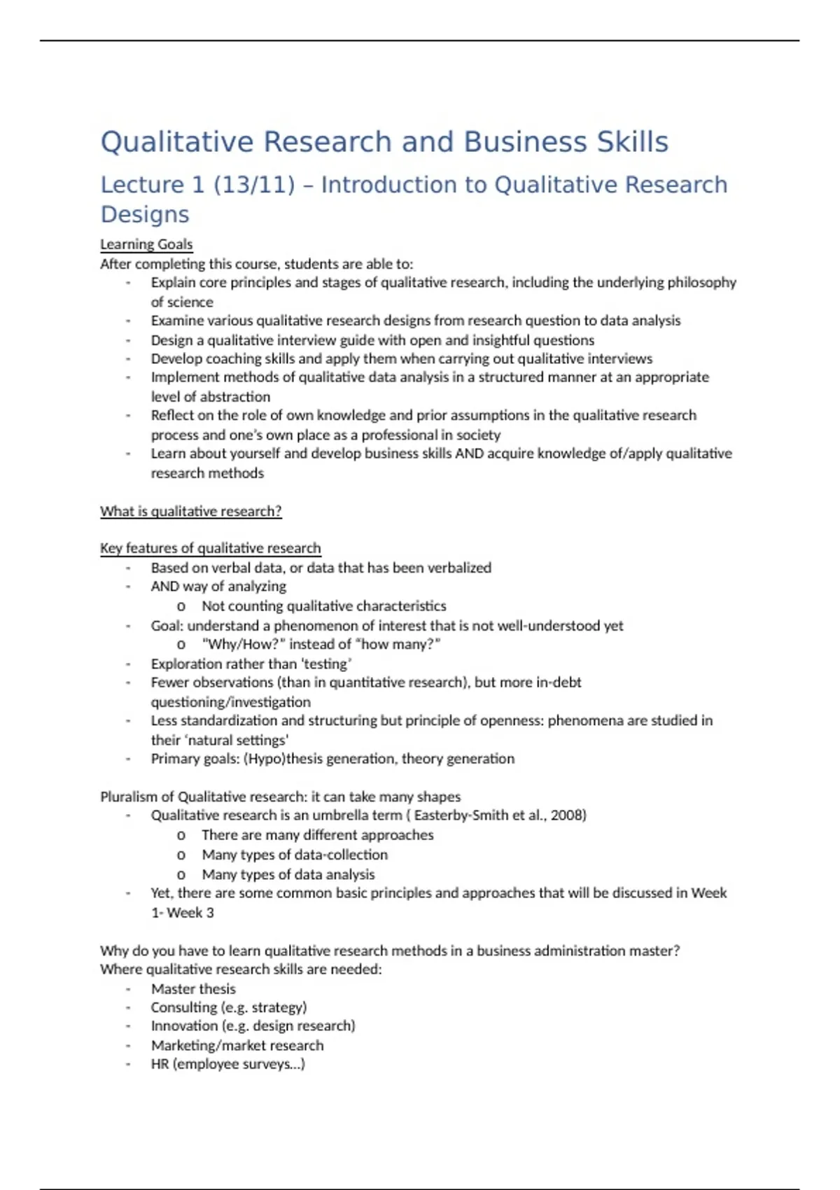Lecture 1 (13/11) – Introduction to Qualitative Research