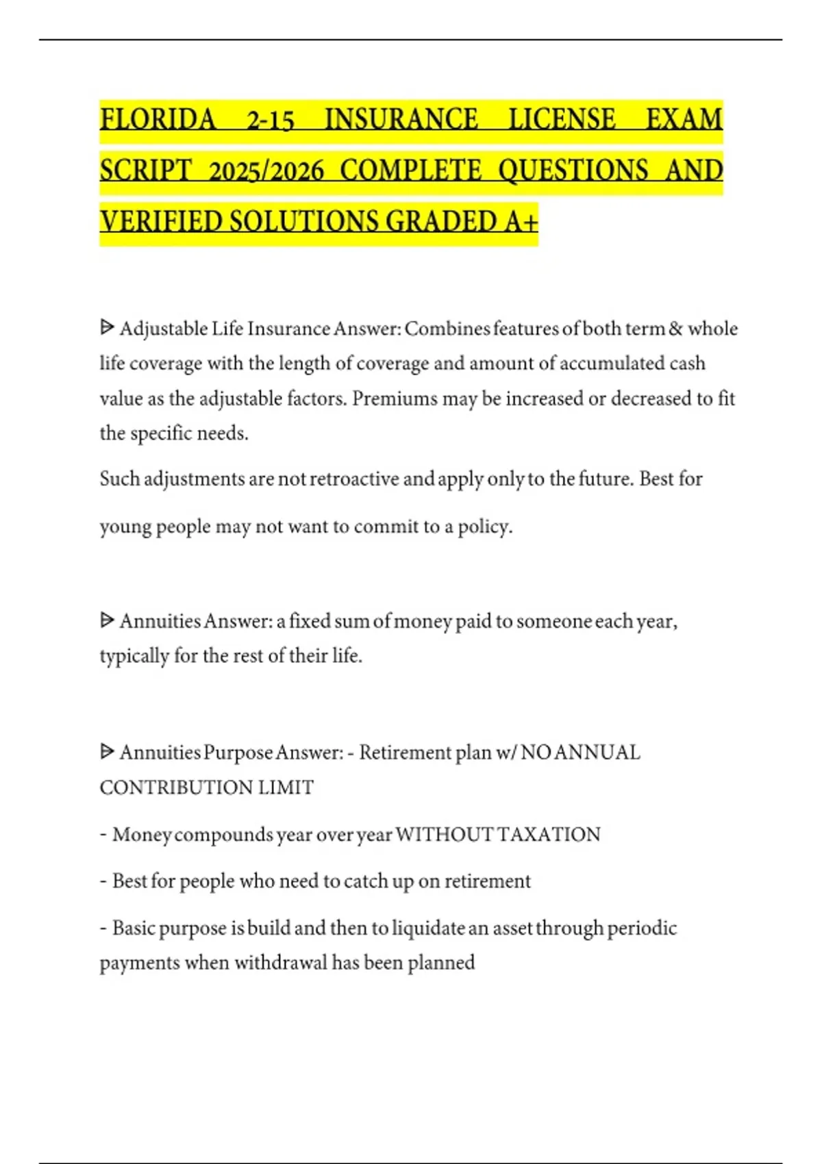 FLORIDA 2-15 INSURANCE LICENSE EXAM SCRIPT 2025/2026 COMPLETE QUESTIONS AND VERIFIED SOLUTIONS GRADED A+