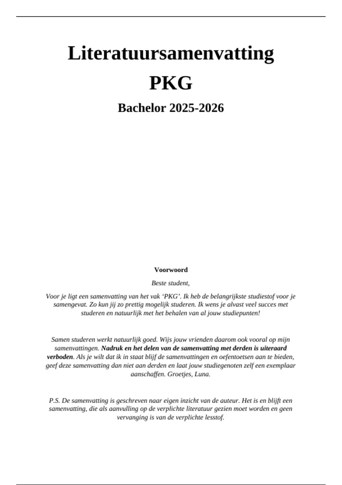 Voor je ligt een samenvatting van het vak ‘PKG’. Ik heb de belangrijkste studiestof voor je