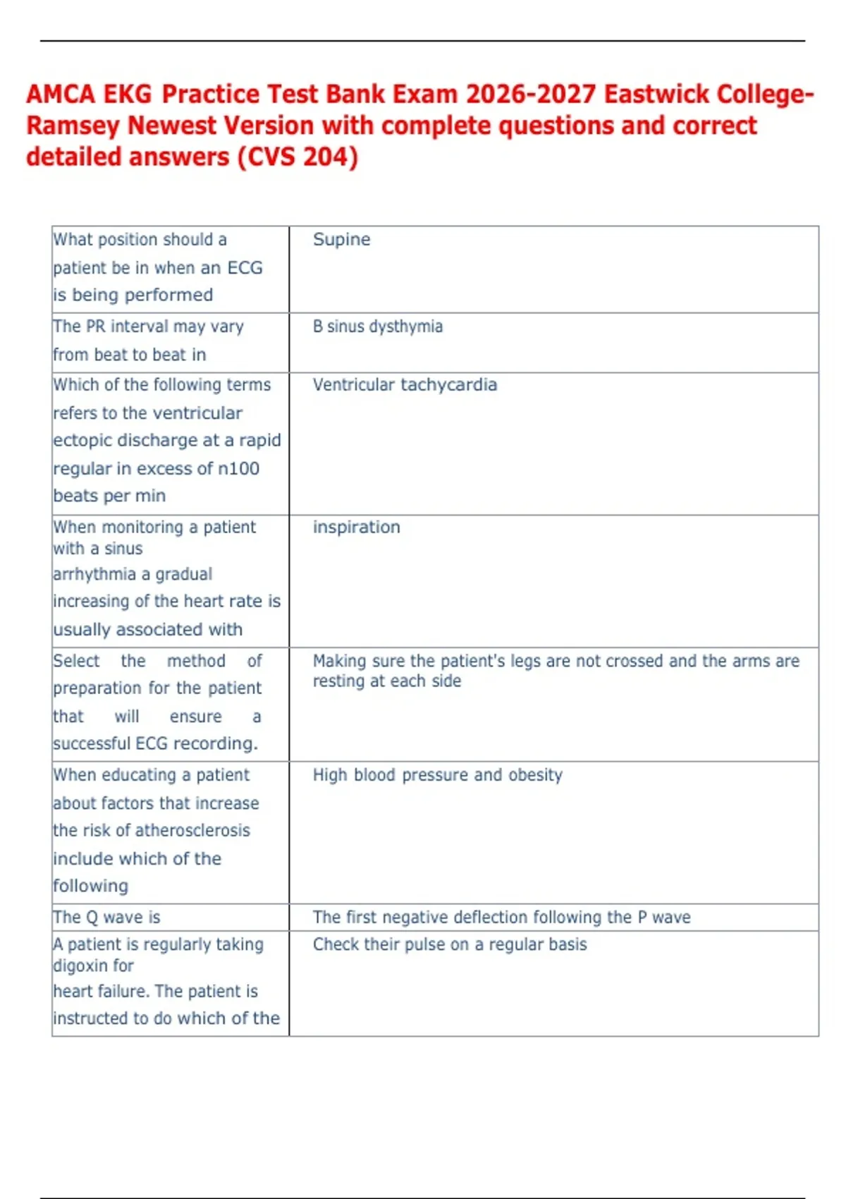 AMCA EKG Practice Test Bank Exam Eastwick College Ramsey Newest Version with complete questions and correct detailed answers (CVS 204)