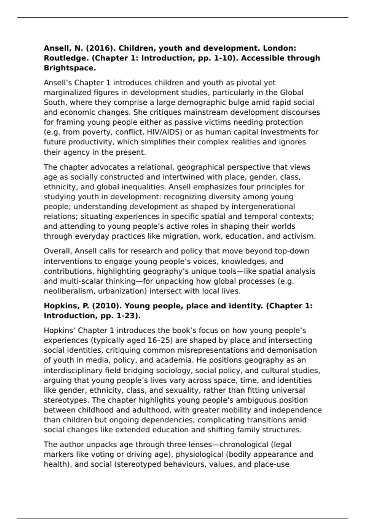 A compact summary of all the literature from the geographies of youth in changing societies course