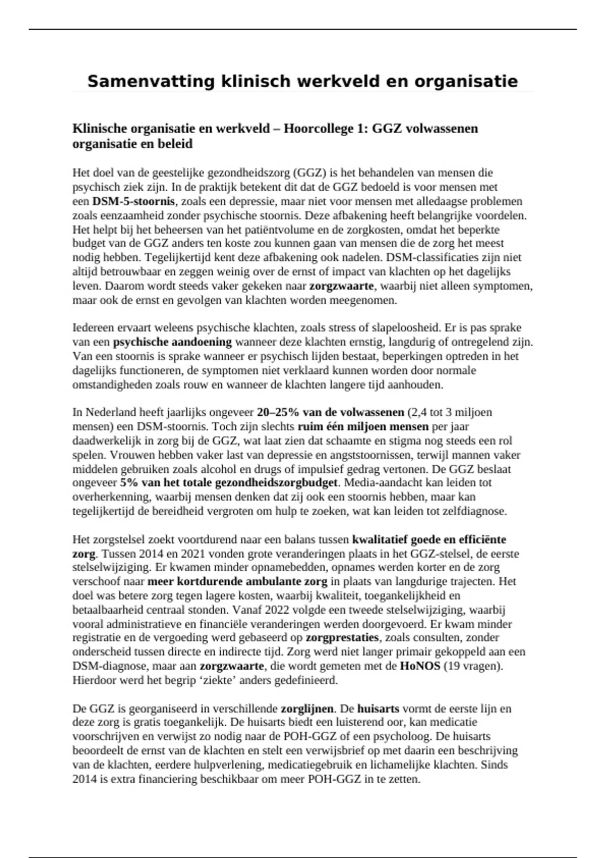 Klinische organisatie en werkveld – Hoorcollege 1: GGZ volwassenen