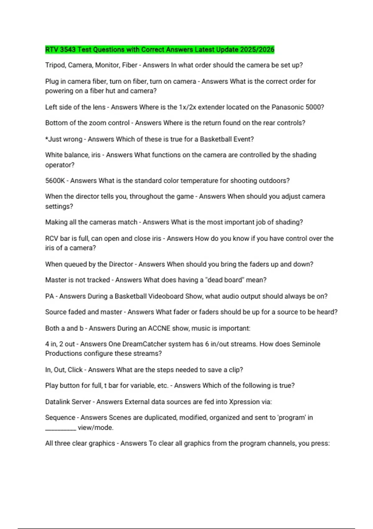 Tripod, Camera, Monitor, Fiber - Answers In what order should the camera be set up?