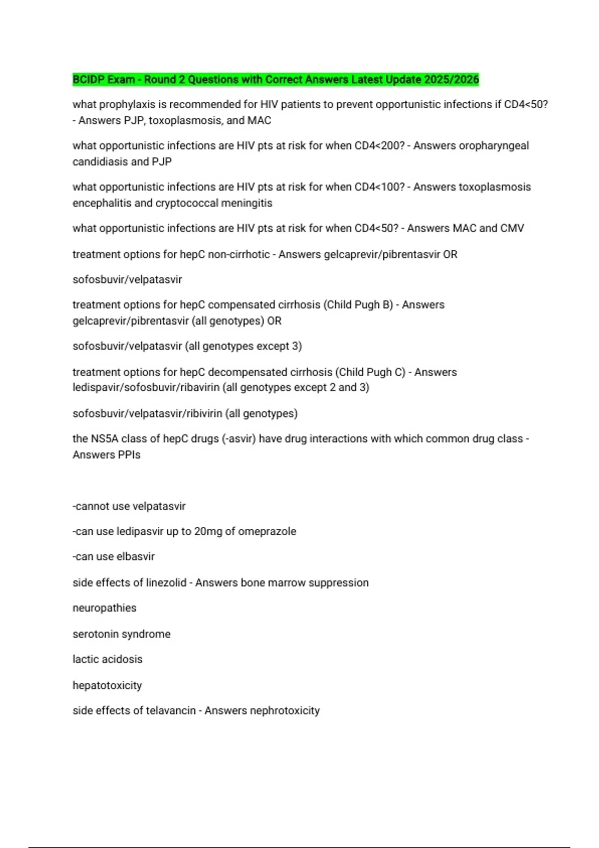 BCIDP Exam - Round 2 Questions with Correct Answers Latest Update 2025/2026 what prophylaxis is recommended for HIV patients to prevent opportunistic infections if CD4<50? - Answers PJP, toxoplasmosis, and MAC what opportunistic infections are HIV pts at risk for when CD4<200? - Answers oropharyngeal candidiasis and PJP what opportunistic infections are HIV pts at risk for when CD4<100? - Answers toxoplasmosis encephalitis and cryptococcal meningitis what opportunistic infections are HIV pts at risk for when CD4<50? - Answers MAC and CMV treatment options for hepC non-cirrhotic - Answers gelcaprevir/pibrentasvir OR sofosbuvir/velpatasvir treatment options for hepC compensated cirrhosis (Child Pugh B) - Answers gelcaprevir/pibrentasvir (all genotypes) OR sofosbuvir/velpatasvir (all genotypes except 3) treatment options for hepC decompensated cirrhosis (Child Pugh C) - Answers ledispavir/sofosbuvir/ribavirin (all genotypes except 2 and 3) sofosbuvir/velpatasvir/ribivirin (all genotypes) the NS5A class of hepC drugs (-asvir) have drug interactions with which common drug class - Answers PPIs -cannot use velpatasvir -can use ledipasvir up to 20mg of omeprazole -can use elbasvir side effects of linezolid - Answers bone marrow suppression neuropathies serotonin syndrome lactic acidosis hepatotoxicity side effects of telavancin - Answers nephrotoxicity NIOSH drug (adverse reproductive effects) infusion related reactions QT prolongation side effects of ceftaroline - Answers hematologic (anemia, leukopenia/neutropenia) rash GI measurement if antibiotic exposure - Answers days of therapy measurement of antibiotic consumption - Answers defined daily dose indications for antibiotics to treat acute otitis media (AOM) - Answers pain for >48 hrs otorrhea if 6 mon to <2 years with bilateral fever >/=39 degrees acute bacterial sinusitis (acute) - Answers 4 weeks acute bacterial sinusitis (subacute) - Answers 1 month to 3 months acute bacterial sinusitis (chronic) - Answers >3 months when is imaging recommended in diagnosing acute bacterial rhinosinusitis - Answers -immunocompromised patients -orbital or intracranial involvment does IDSA support watchful waiting in acute bacterial sinusitis? - Answers no major feature of acute bacterial sinusitis - Answers purulent nasal discharge and fever lasting 72-96hrs main pathogens that cause acute bacterial sinusitis - Answers strep pneumo H. influenza Moraxella catarhalis staph aureus which patients should be getting high dose augmentin (2g BID) for acute bacterial sinusitis? - Answers -severe infection (fever and/or systemic signs) -pts at high risk for MDR infection -in high endemic area for strep pneumo resistance to penicillin