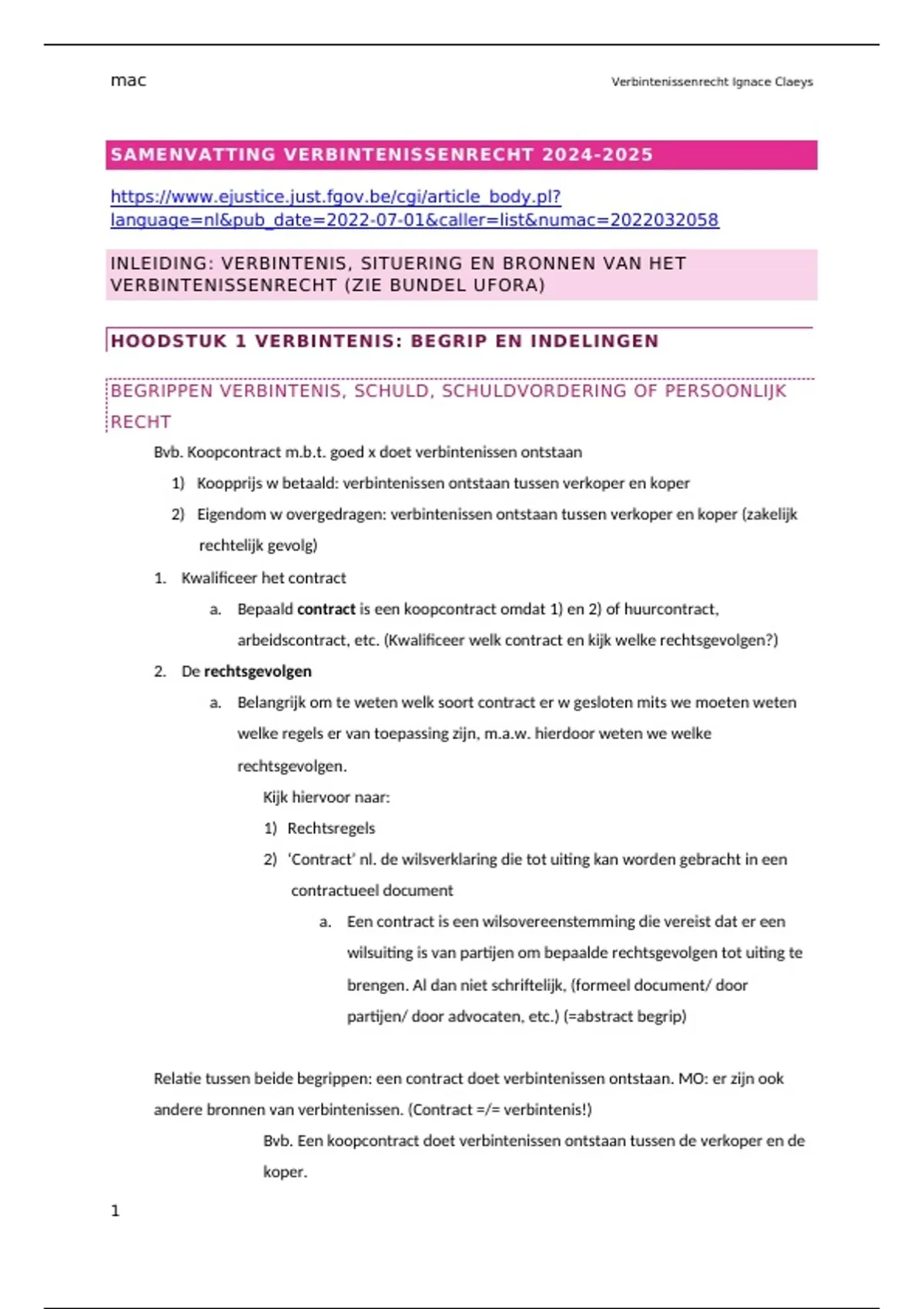 SAMENVATTING VERBINTENISSENRECHT 2024-2025
