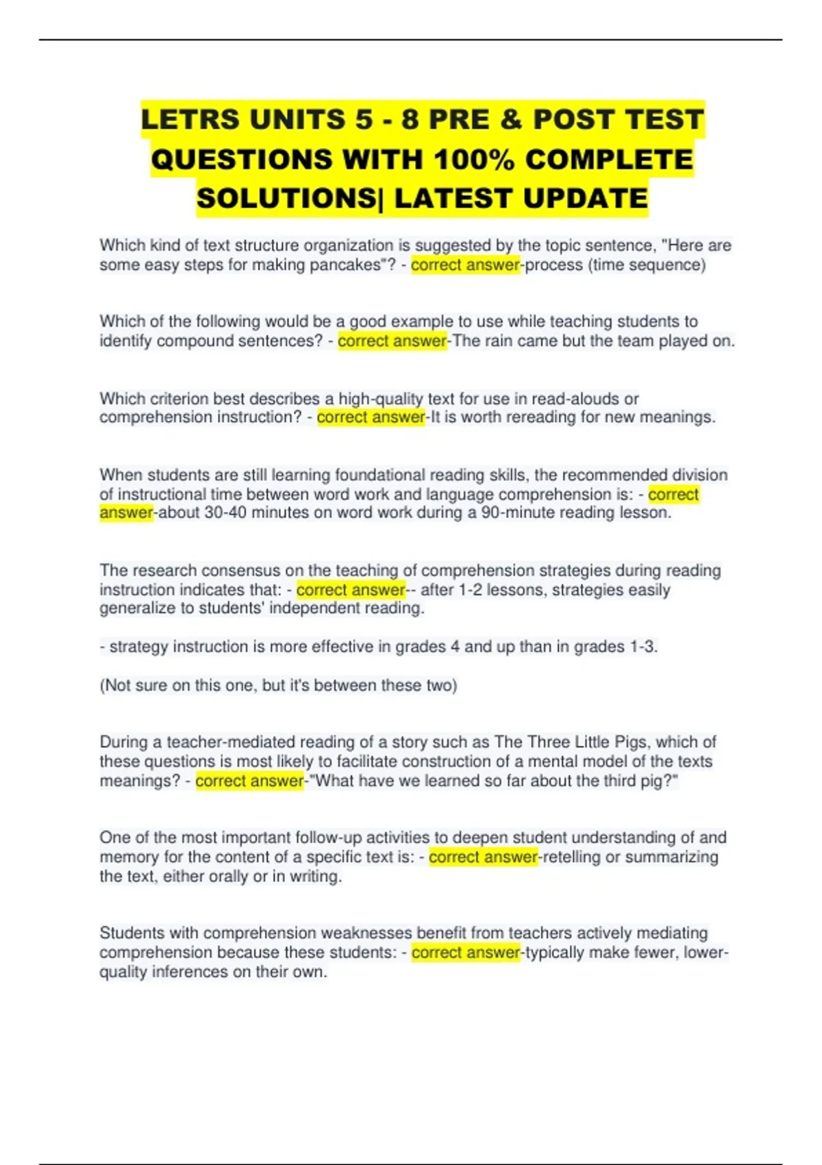 LETRS UNITS 5 - 8 PRE & POST TEST QUESTIONS WITH 100% COMPLETE SOLUTIONS| LATEST UPDATE