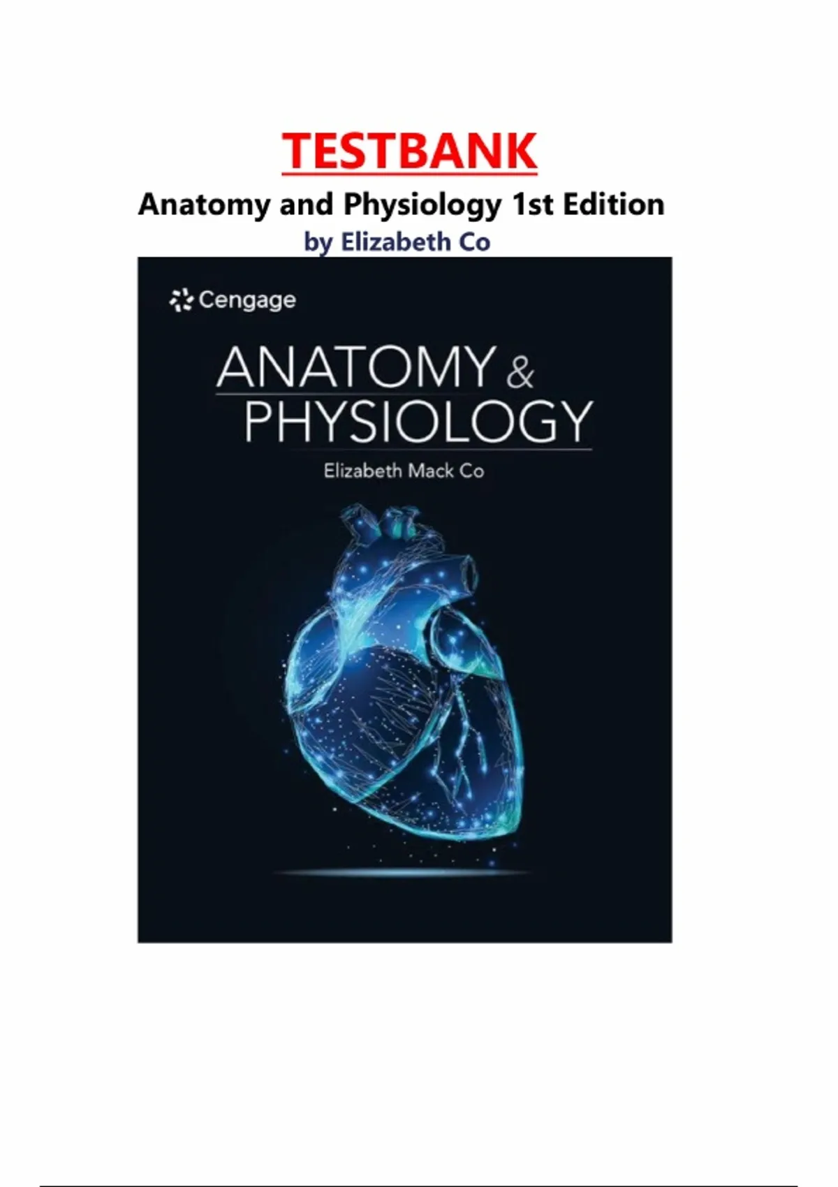 The Complete Test Bank for Anatomy and Physiology, 1st Edition (2023) by Elizabeth Co provides a verified and comprehensive collection of assessment questions aligned with every chapter of the official textbook. Designed for undergraduate anatomy and physiology courses, this instructor resource features multiple-choice, labeling, and application-based questions that test conceptual understanding, anatomical relationships, and physiological mechanisms across all body systems. According to the verified Table of Contents, the textbook is organized into six instructional units: Unit 1: Levels of Organization includes Chapter 2: An Introduction to the Human Body, Chapter 3: The Chemical Level of Organization, Chapter 4: The Cellular Level of Organization, and Chapter 5: The Tissue Level of Organization. Unit 2: Support and Movement covers Chapter 6: The Integumentary System, Chapter 7: Bone Tissue and the Skeletal System, Chapter 8: The Axial Skeleton, Chapter 9: The Appendicular Skeleton, Chapter 10: Joints, Chapter 11: Muscle Tissue, and Chapter 12: The Muscular System. Unit 3: Regulation, Integration, and Control follows with Chapter 13: Nervous Tissue and the Nervous System, Chapter 14: Anatomy of the Nervous System, Chapter 15: The Somatic Nervous System, Chapter 16: The Autonomic Nervous System, and Chapter 17: The Endocrine System. Unit 4: Fluids and Transport includes Chapter 18: The Cardiovascular System: Blood, Chapter 19: The Cardiovascular System: Heart, Chapter 20: The Cardiovascular System: Blood Vessels and Circulation, and Chapter 21: The Lymphatic and Immune Systems. Unit 5: Energy, Maintenance, and Environmental Exchange features Chapter 22: The Respiratory System, Chapter 23: The Digestive System, Chapter 24: Metabolism and Nutrition, Chapter 25: The Urinary System, and Chapter 26: Fluid, Electrolyte, and Acid–Base Balance. Unit 6: Deviations from Homeostasis concludes the text with Chapter 27: The Reproductive System.