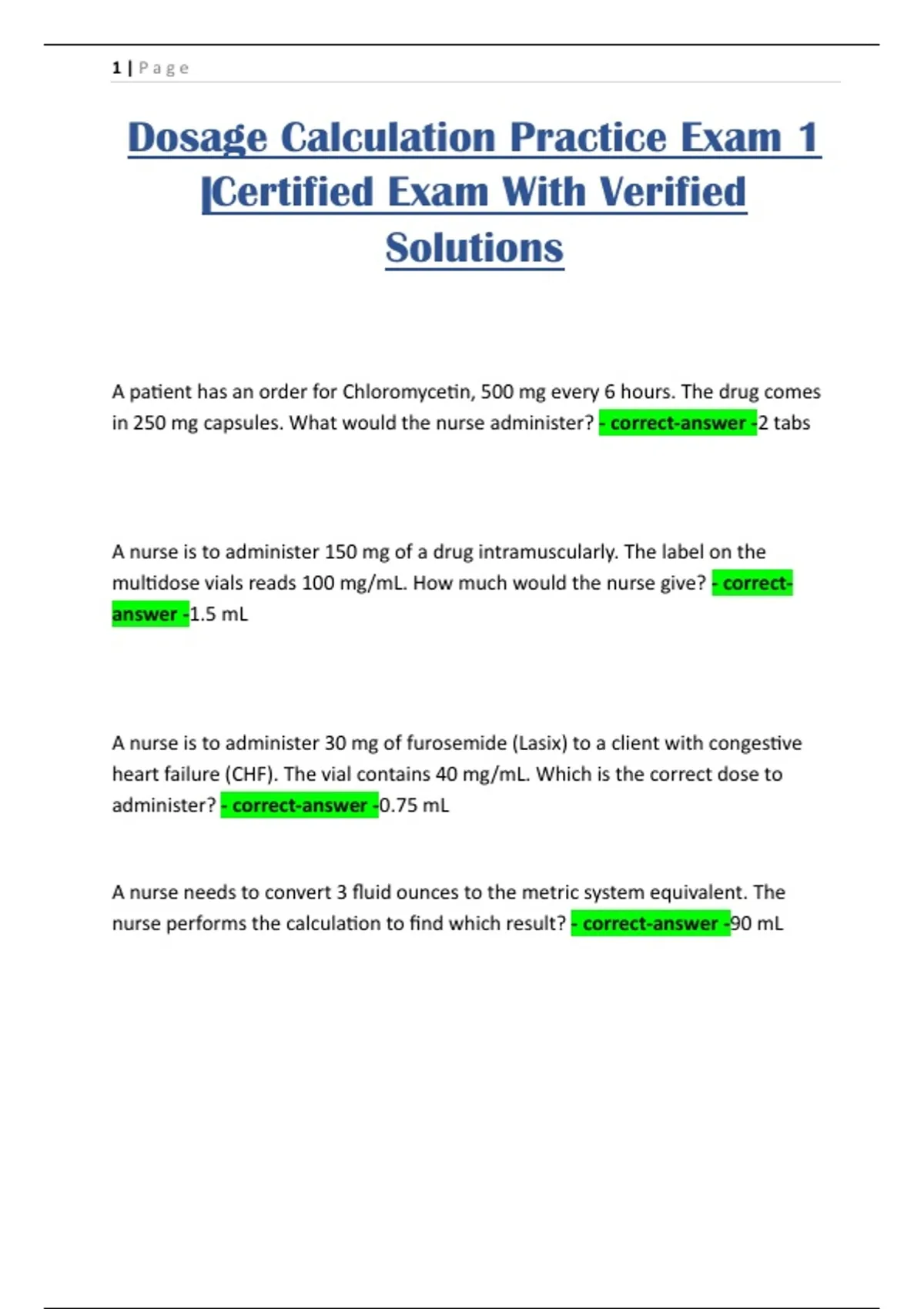 Dosage Calculation Practice Exam 1 |Certified Exam With Verified Solutions