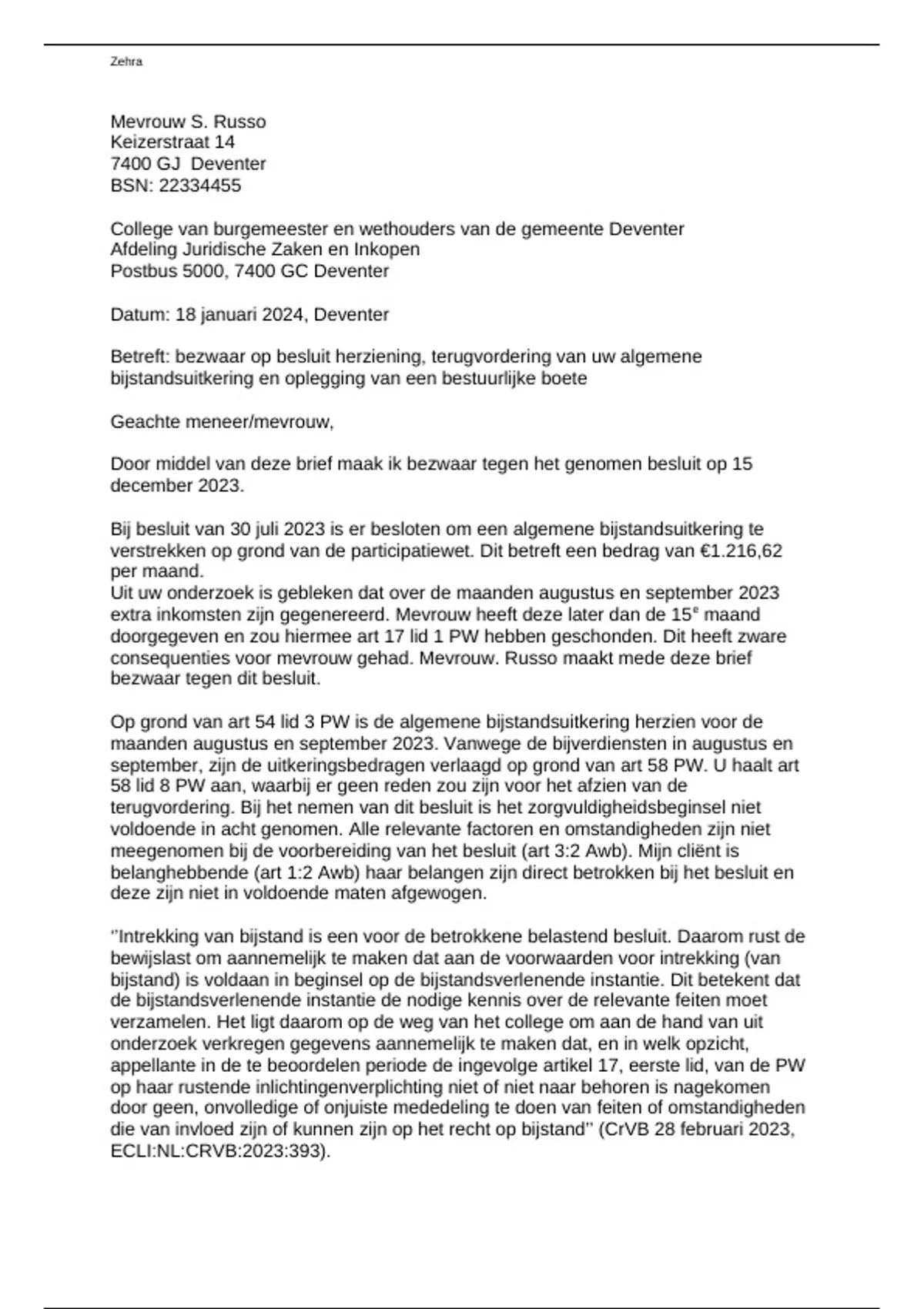 Dit tentamen bestaat uit het opstellen van een juridisch bezwaarschrift namens een cliënt (mevrouw Russo) tegen een besluit van de gemeente Deventer. Het besluit betreft de herziening, terugvordering van de bijstandsuitkering en oplegging van een bestuurlijke boete.