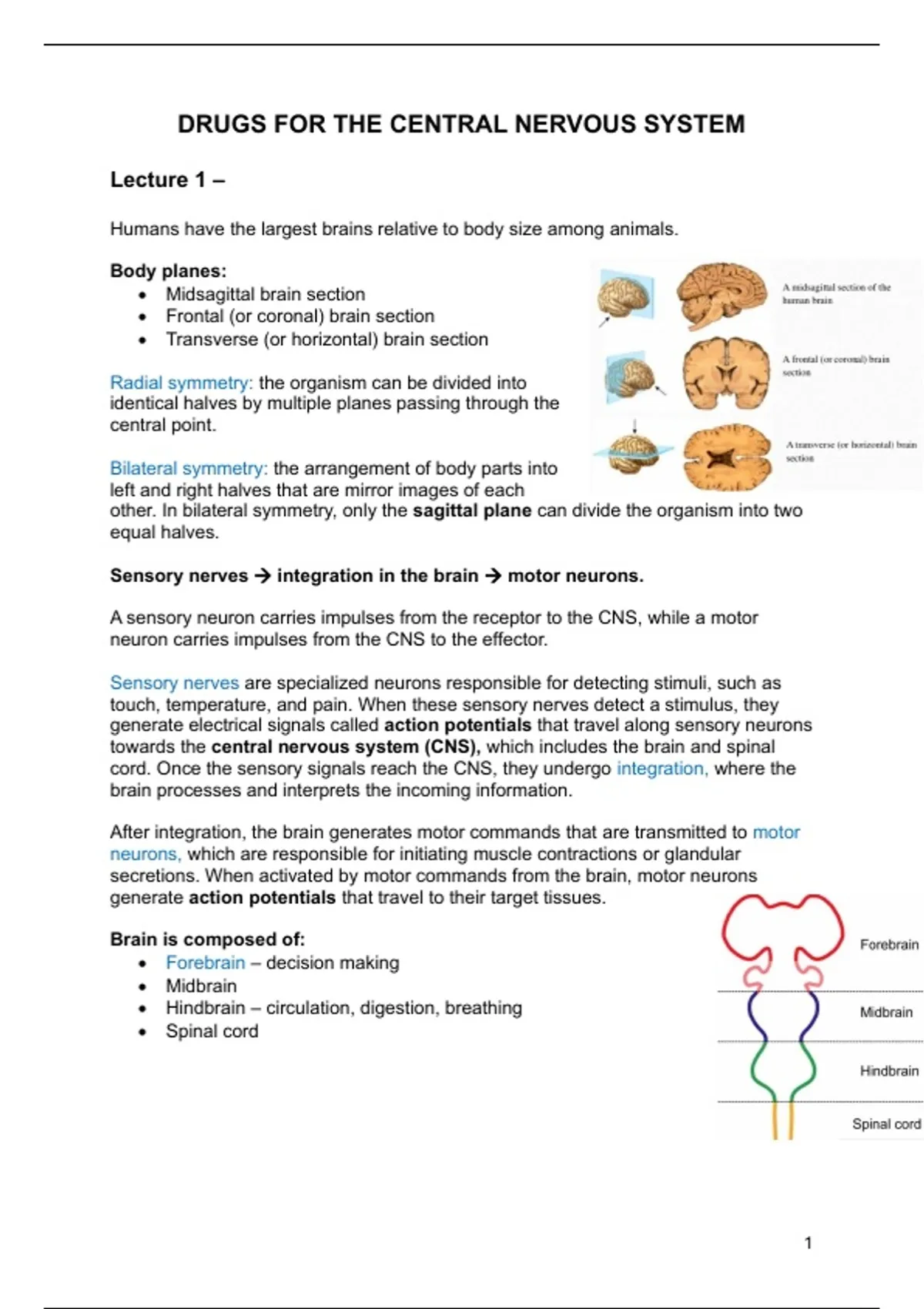 towards the central nervous system (CNS), which includes the brain and spinal